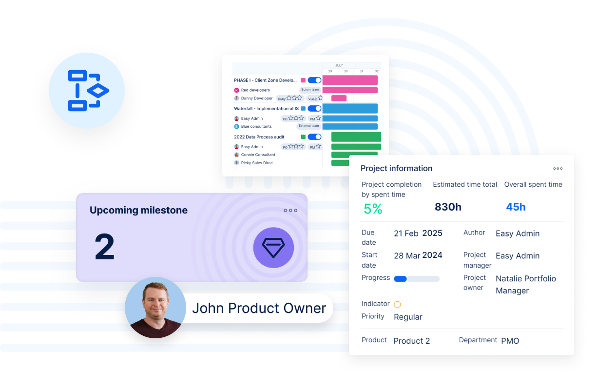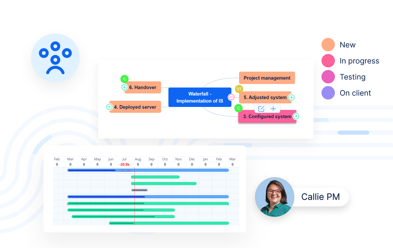 Easy8 podporuje jak Waterfall pro strukturované inženýrské úkoly, tak Agile pro dynamické softwarové projekty, což umožňuje efektivní řízení různorodých typů projektů. Tento hybridní přístup zajišťuje plynulejší přechody mezi metodologiemi, pomáhá vám dodávat projekty včas a v rámci stanoveného rozsahu.