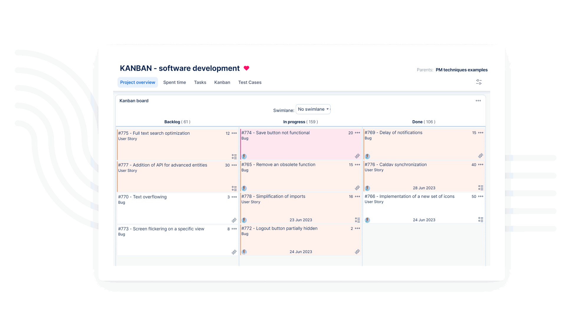 Kanban board byl původně vynalezen pro vývojové týmy, dnes je užitečný pro jakéhokoli projektového manažera a další oddělení. Kanban metodologie, která se vyvinula mimo IT oblast, může přinést transparentnost a adaptaci do jakéhokoli projektu. S Redmine Kanban můžete vizualizovat svůj projekt a používat drag & drop pro aktualizaci úkolů, milníků, přiřazení a dalších. Získejte výhody vizualizace a optimalizace Kanbanu na každém projektu.