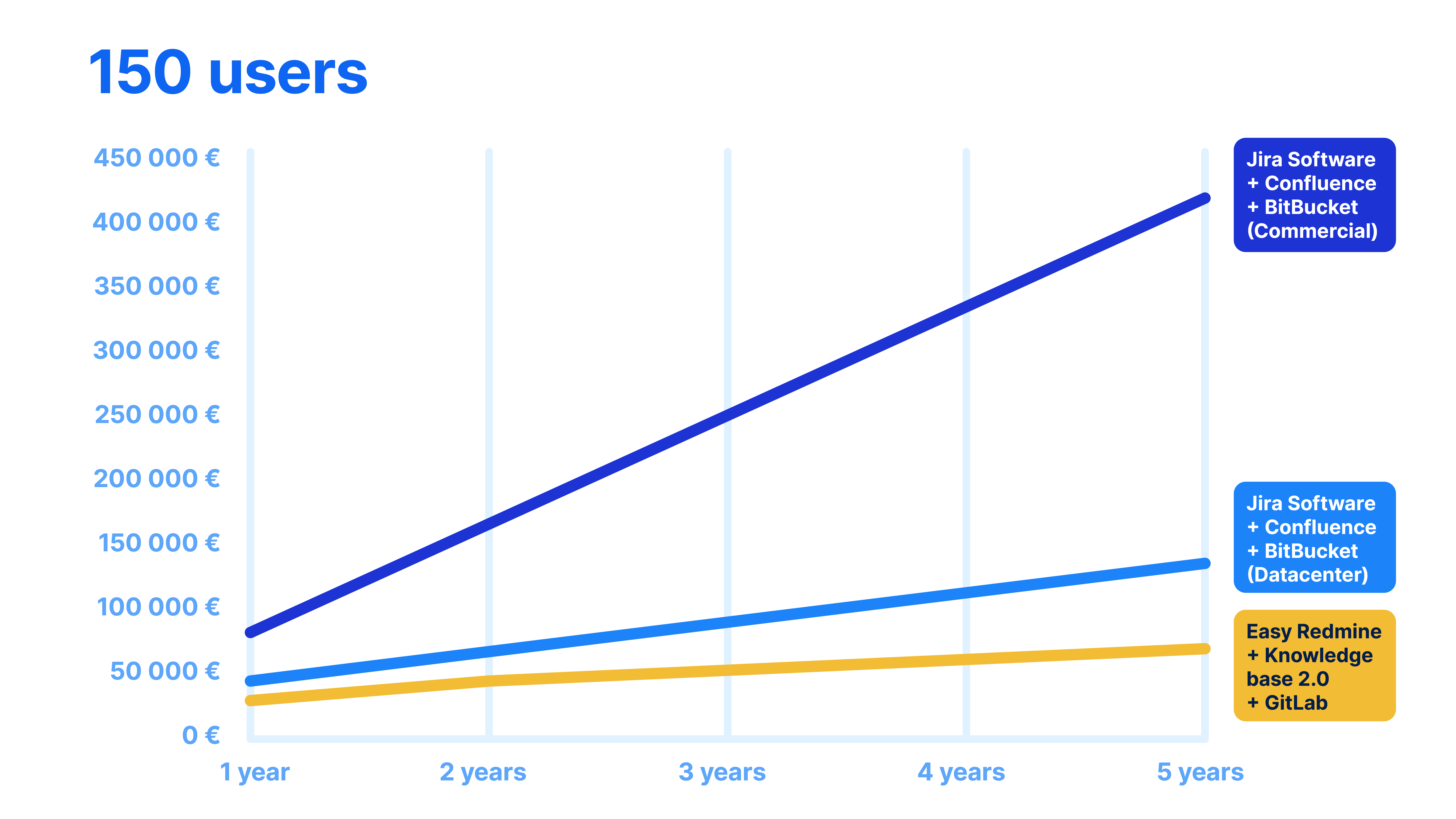 Fall mit 150 Benutzern: Jira Software + Confluence + BitBucket vs. Easy8 + Wissensdatenbank 2.0 + GitLab