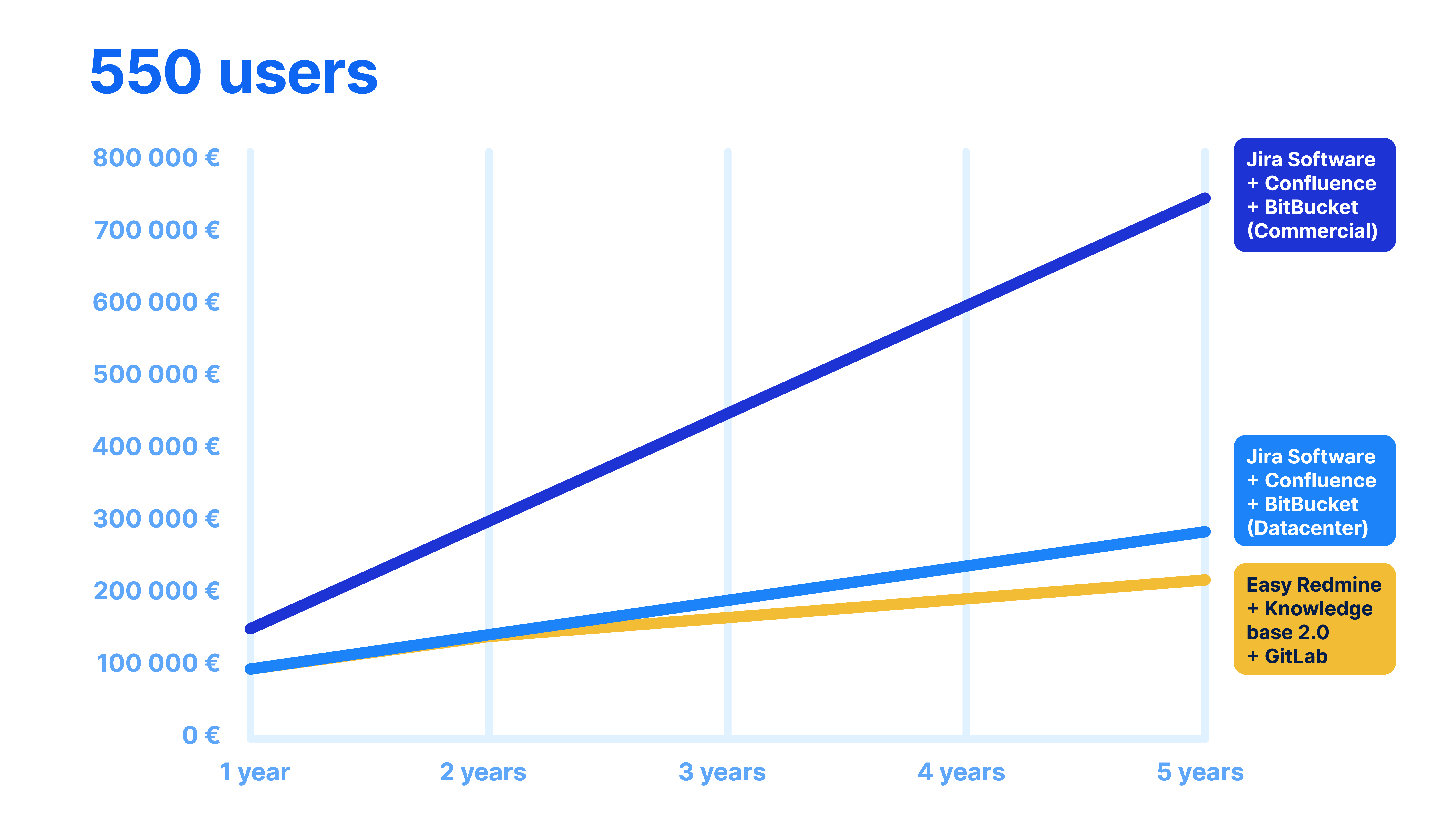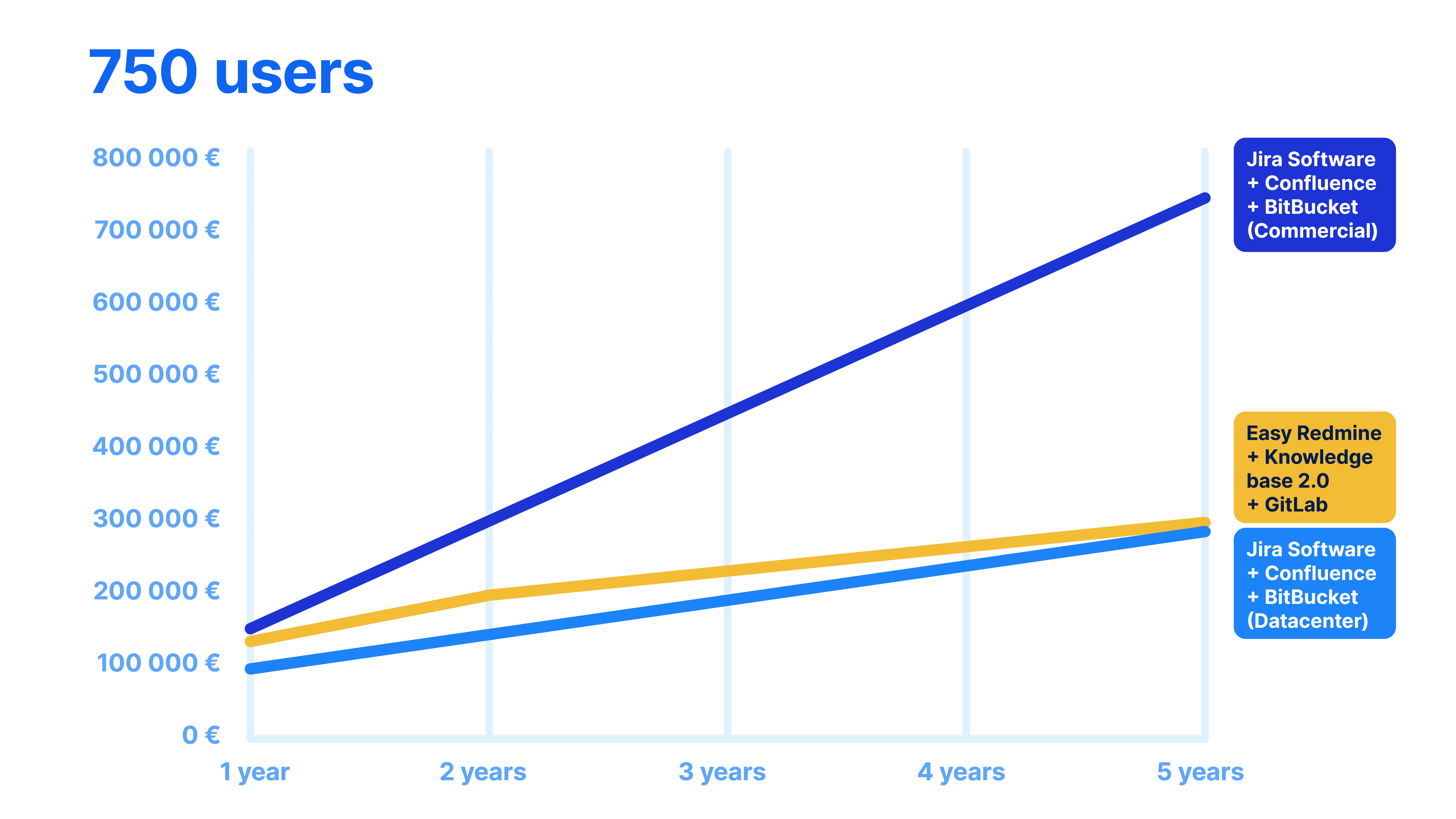 Fall mit 750 Benutzern: Jira Software + Confluence + BitBucket vs. Easy8 + Wissensdatenbank 2.0 + GitLab (750 Benutzer)
