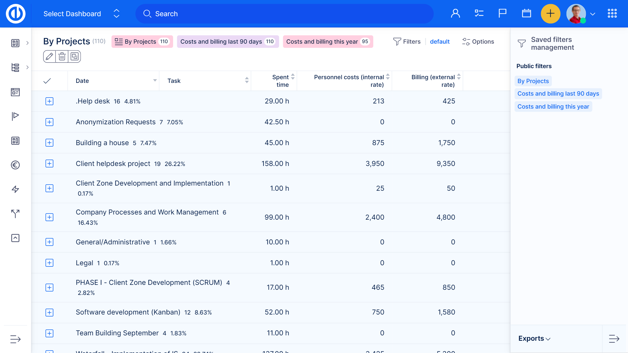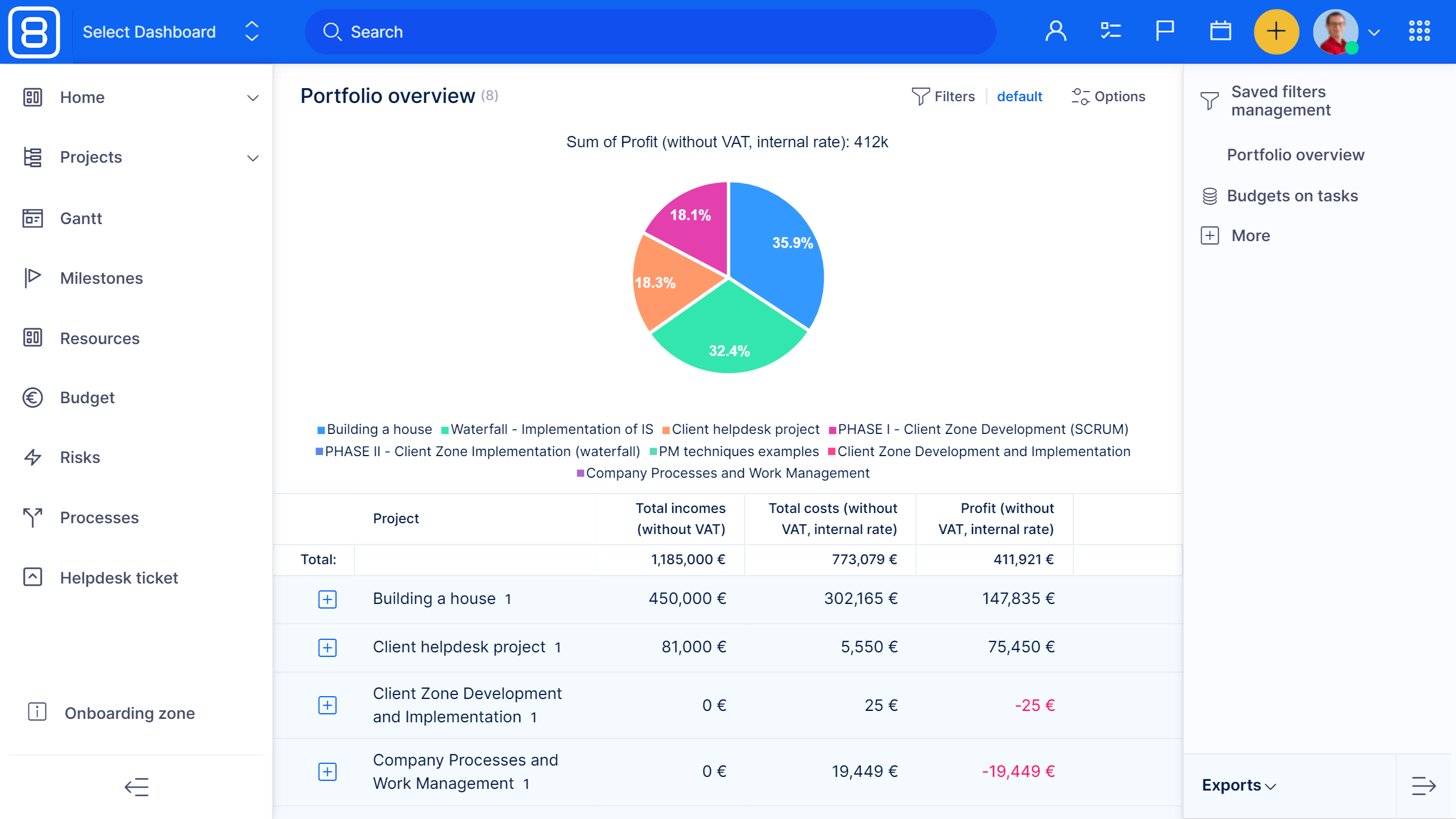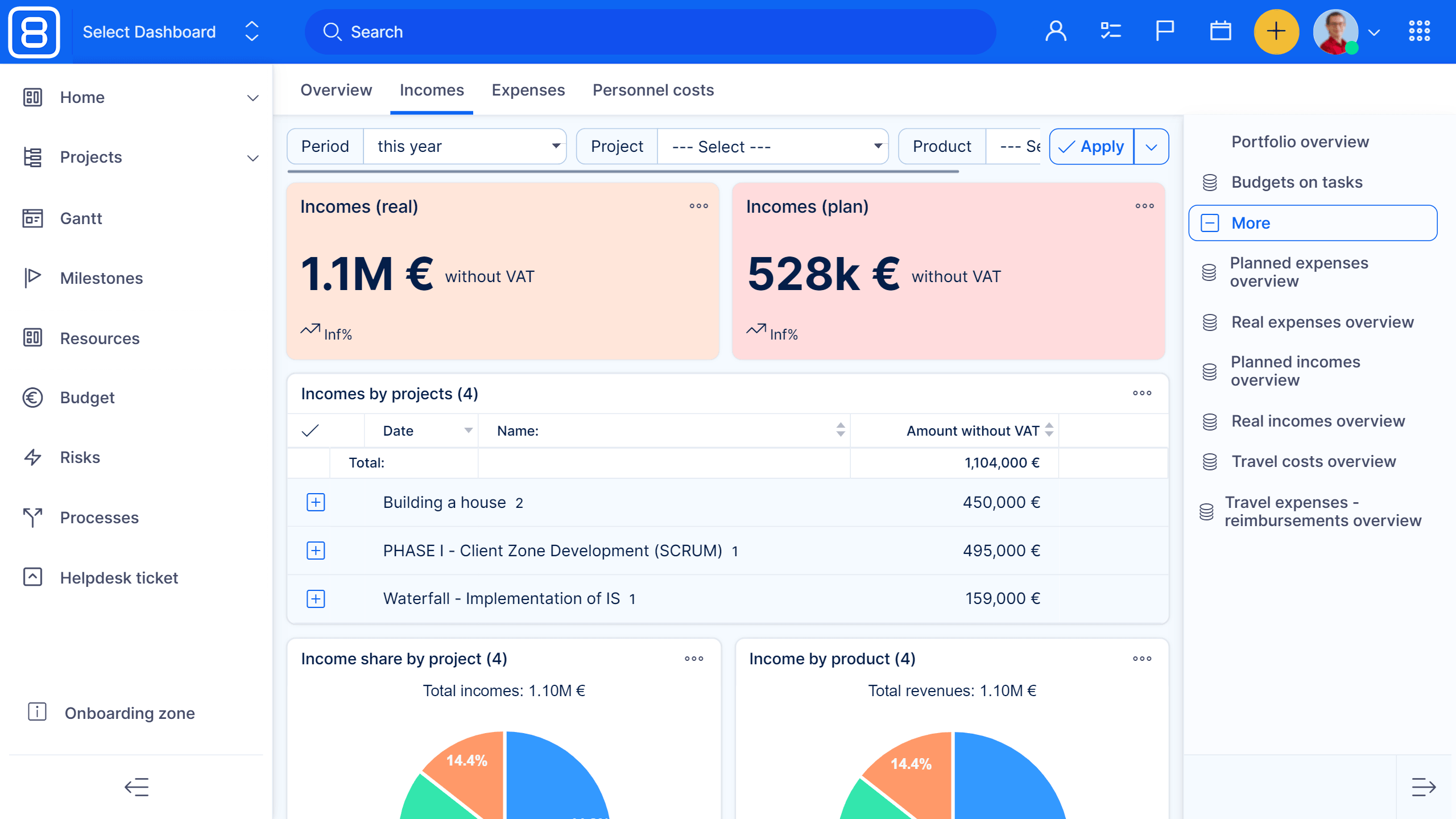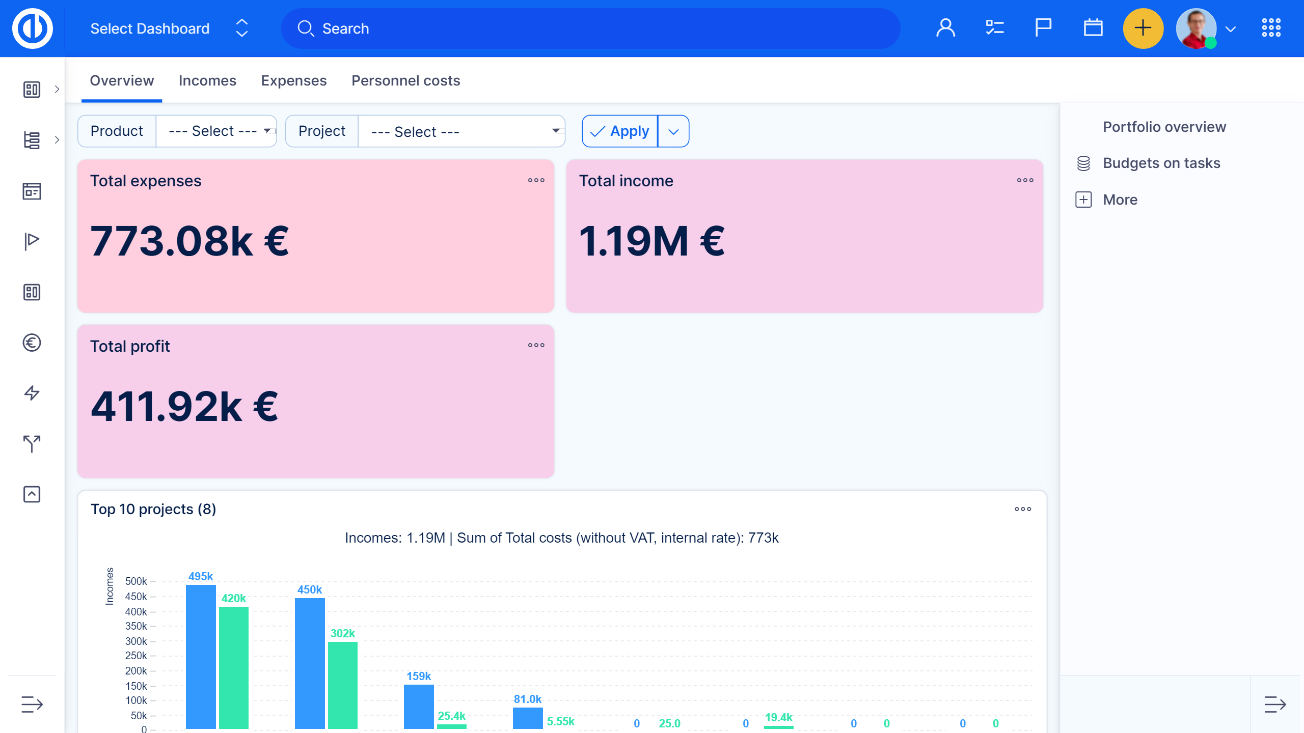 Dashboard für Budgets-Anweisungen ist eine Schnittstelle für Finanzmanager und Analysten, um schnell die Bedeutung von Budget- und Prognosedaten auf einen Blick zu erkennen. Erstellen Sie das Budget und die Prognosepläne. Sehen Sie sich Projekte mit den höchsten Einnahmen, Gesamtkosten und Gewinnen an. Kontrollieren Sie die Erfüllung Ihres Gewinns oder vergleichen Sie Finanzdaten mit der Vorperiode.