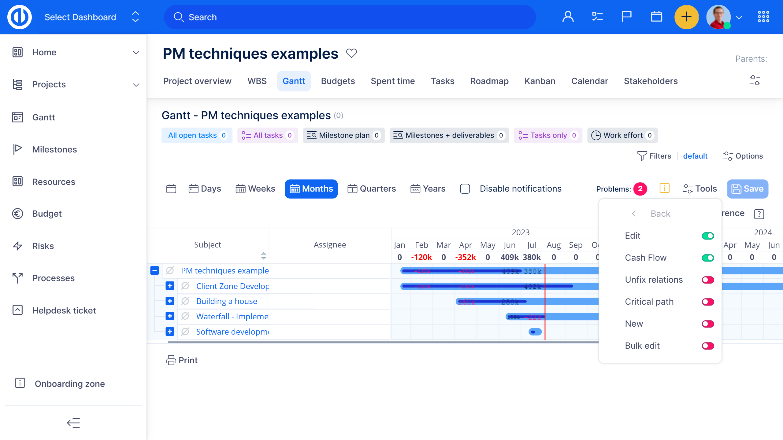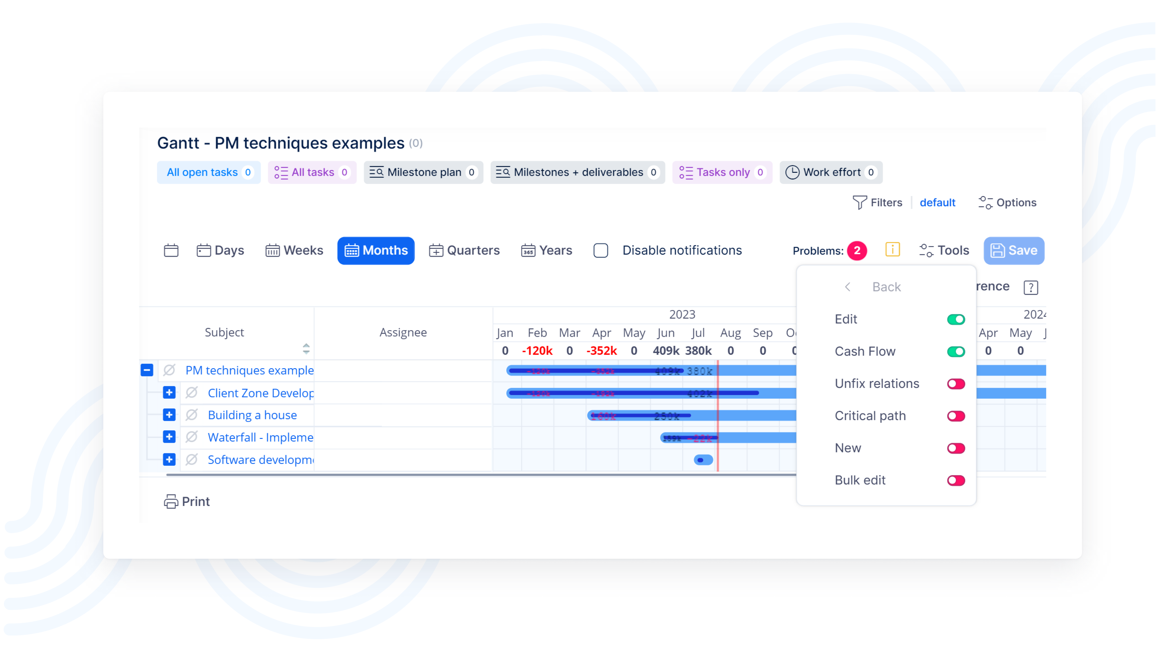 Cashflows in Ihrem Gantt Diagramm sind ein nützliches Tool für einen direkten Überblick über die Projektrentabilität, den Vergleich von geplantem und tatsächlichem Cashflow und einen besseren Ausgleich der Cashflows aller Projekte.