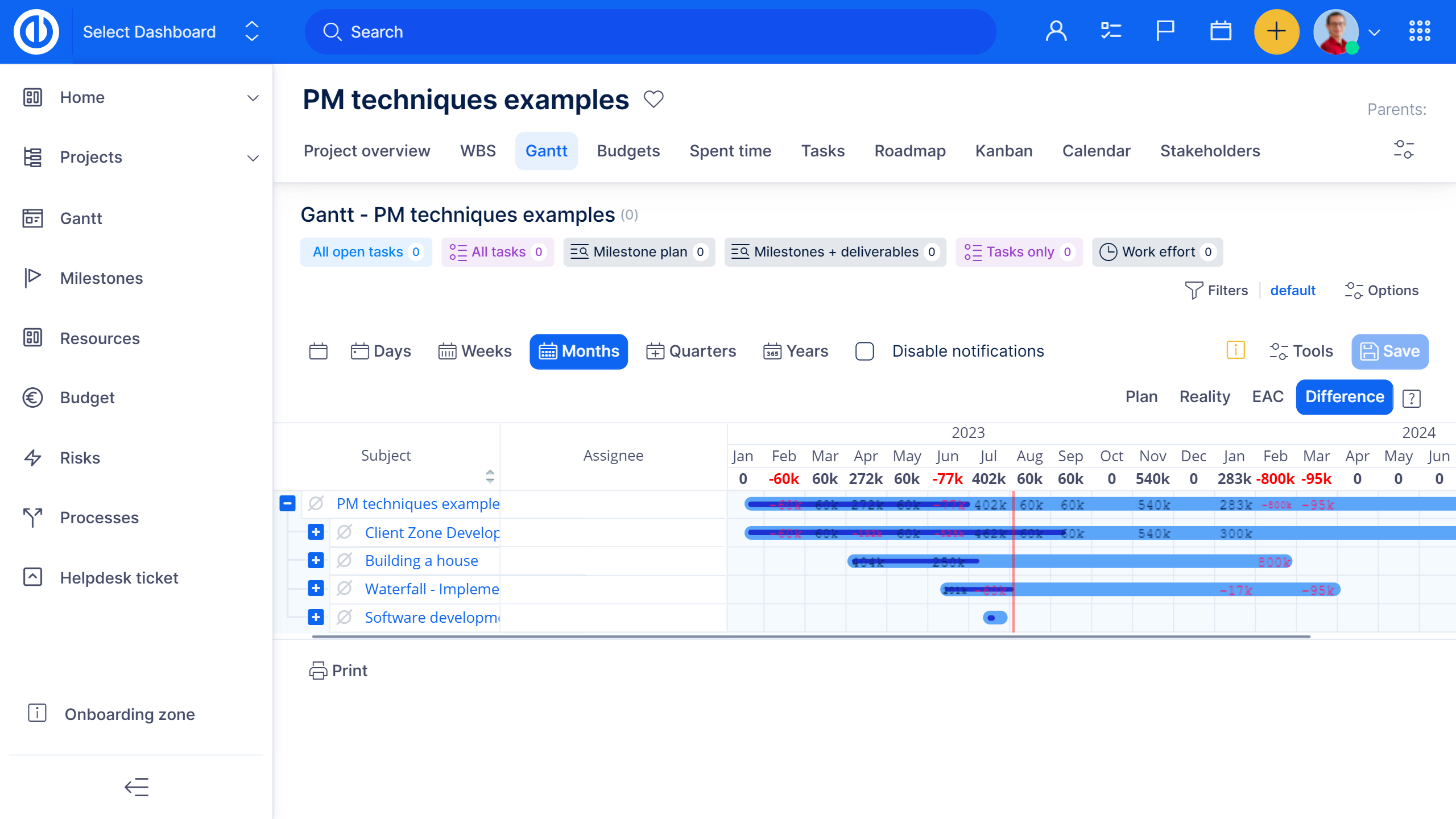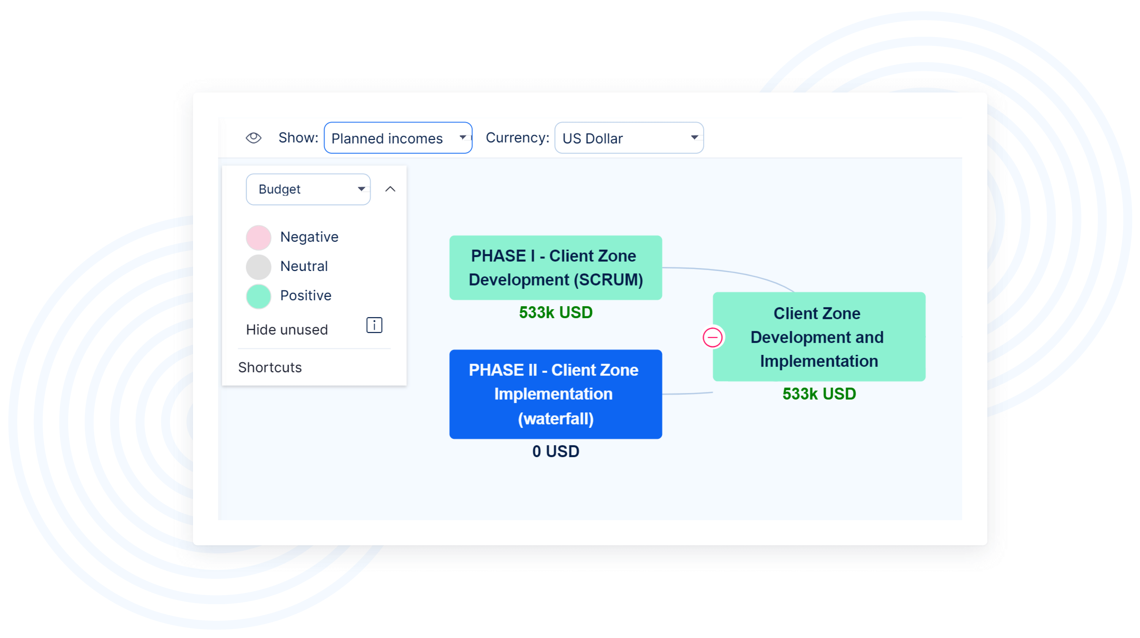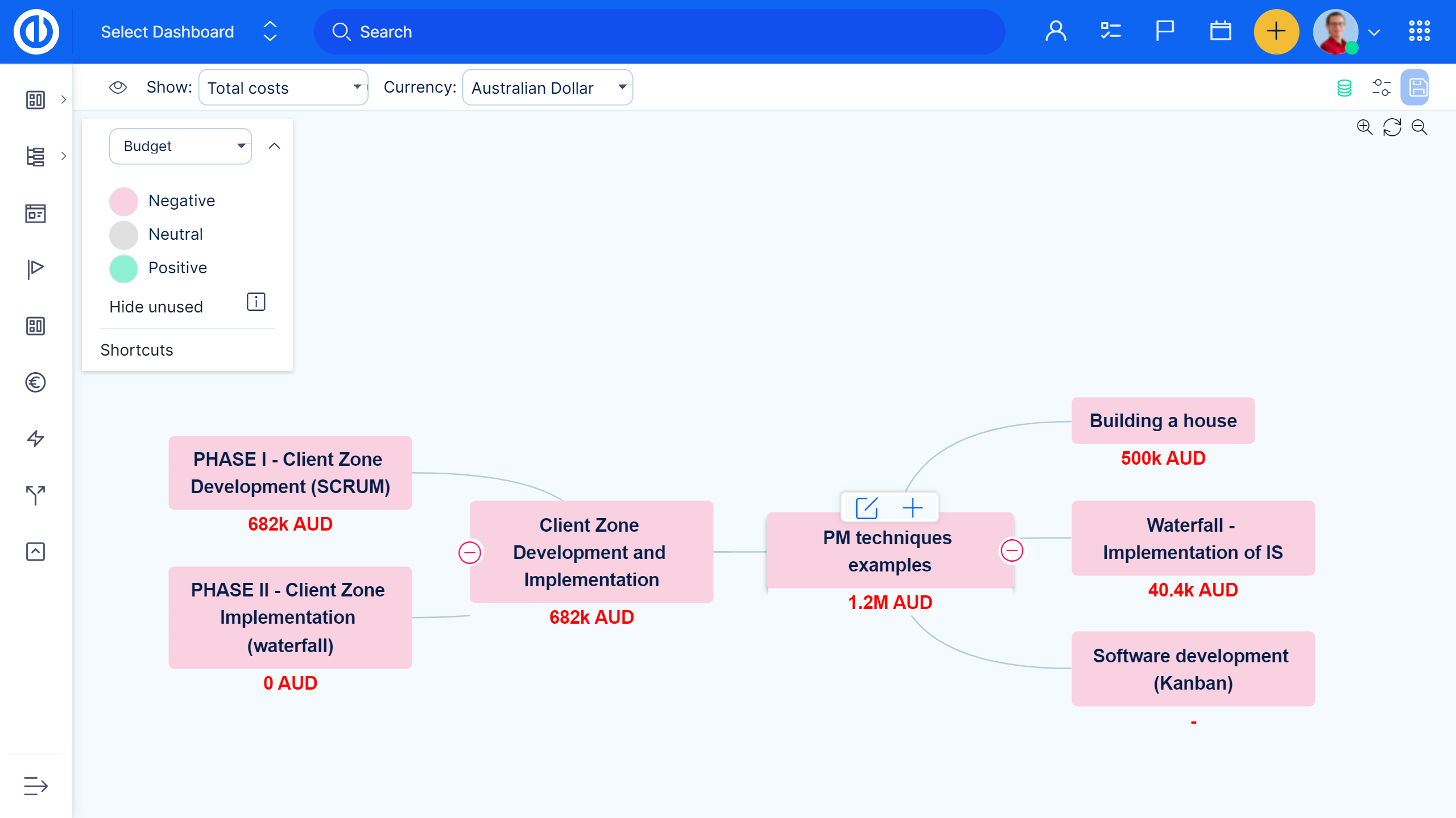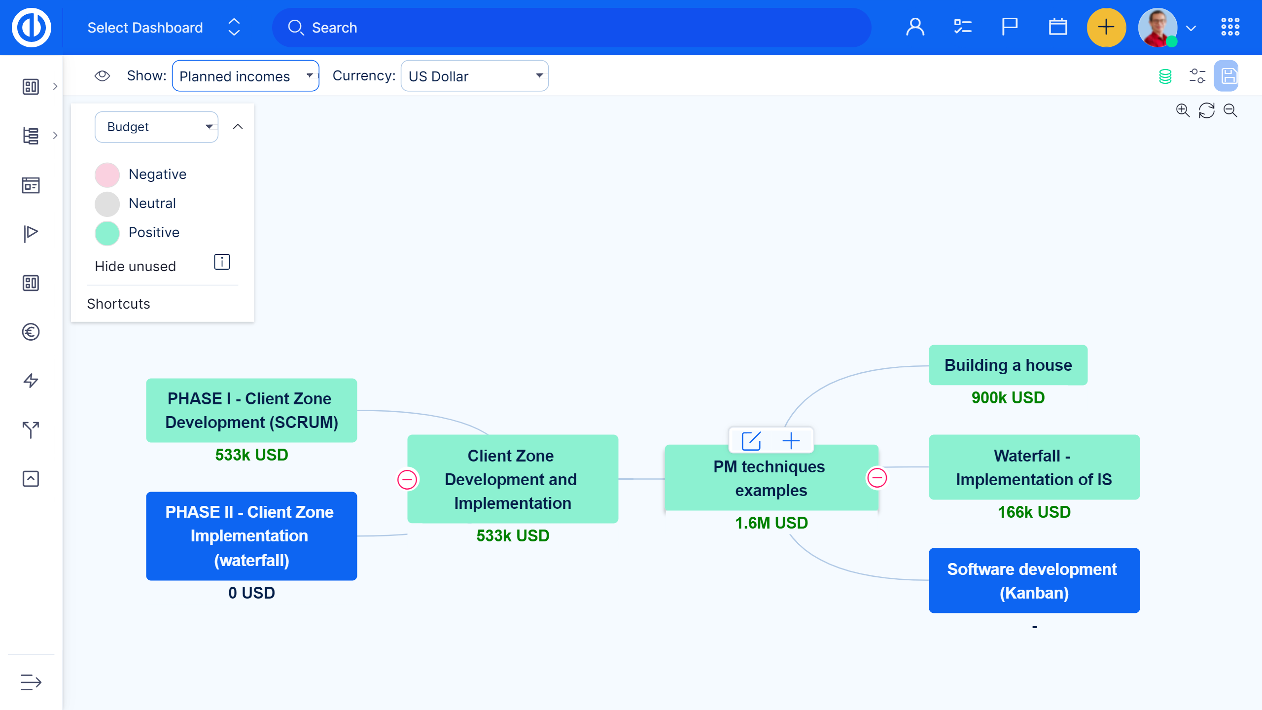 Projektfinanzen können visuell sein. Um Kostenstrukturplan zu haben, müssen Sie sowohl WBS als auch Budgets Plugins installiert haben. Alle WBS-Finanzen basieren auf Daten des Projektbudgets, bei denen die Einnahmen / Kosten und Personalkosten in Planung und Realität sind. Dieses Plugin ist besonders nützlich bei der Projektplanung, in der Budgetierungsphase und bei der laufenden Überwachung der Projektfinanzierung.