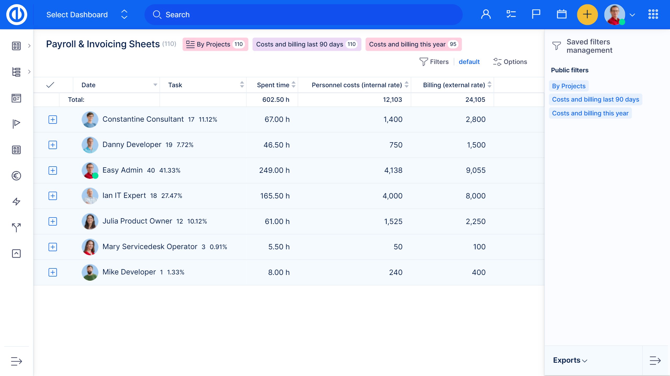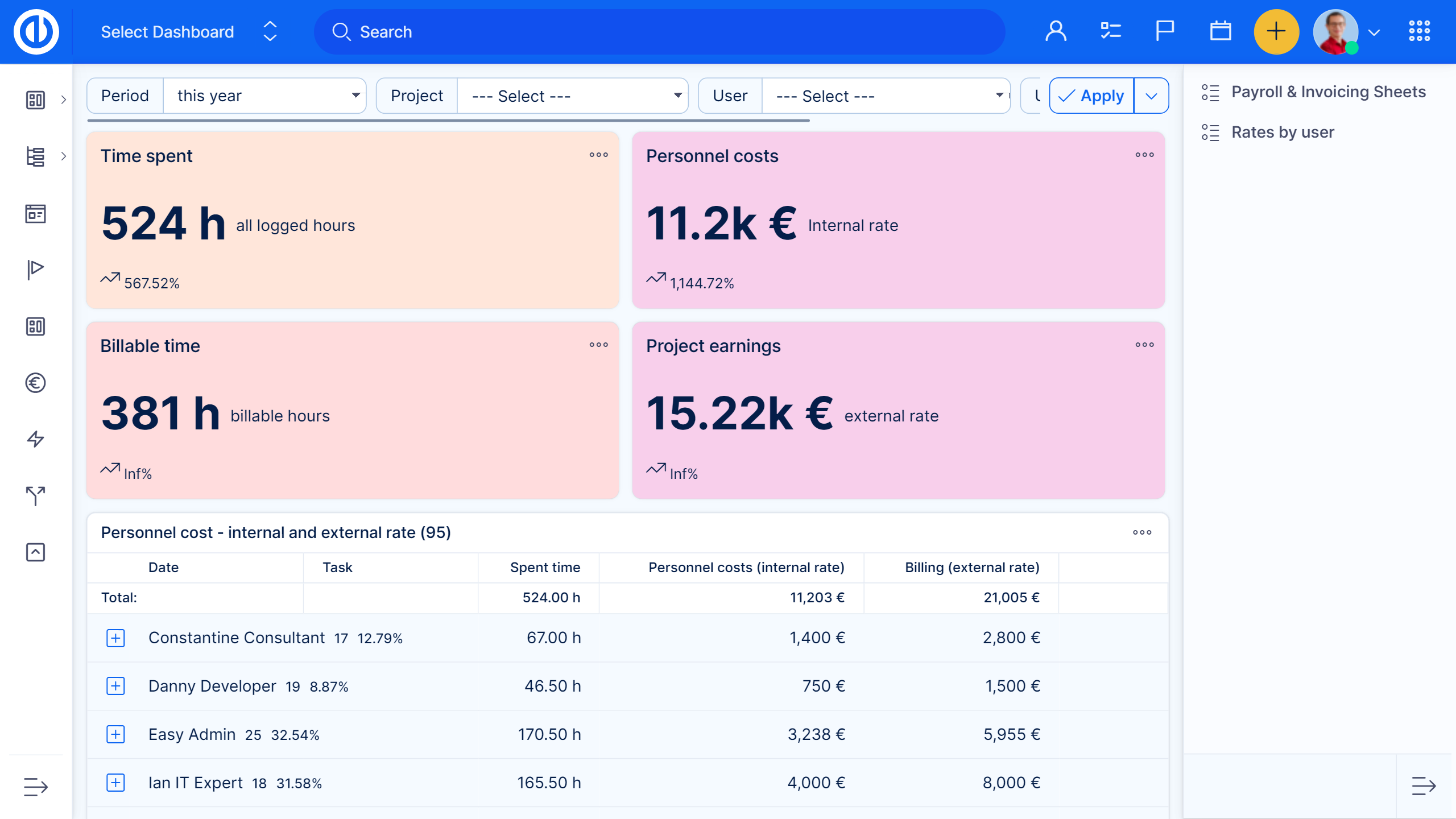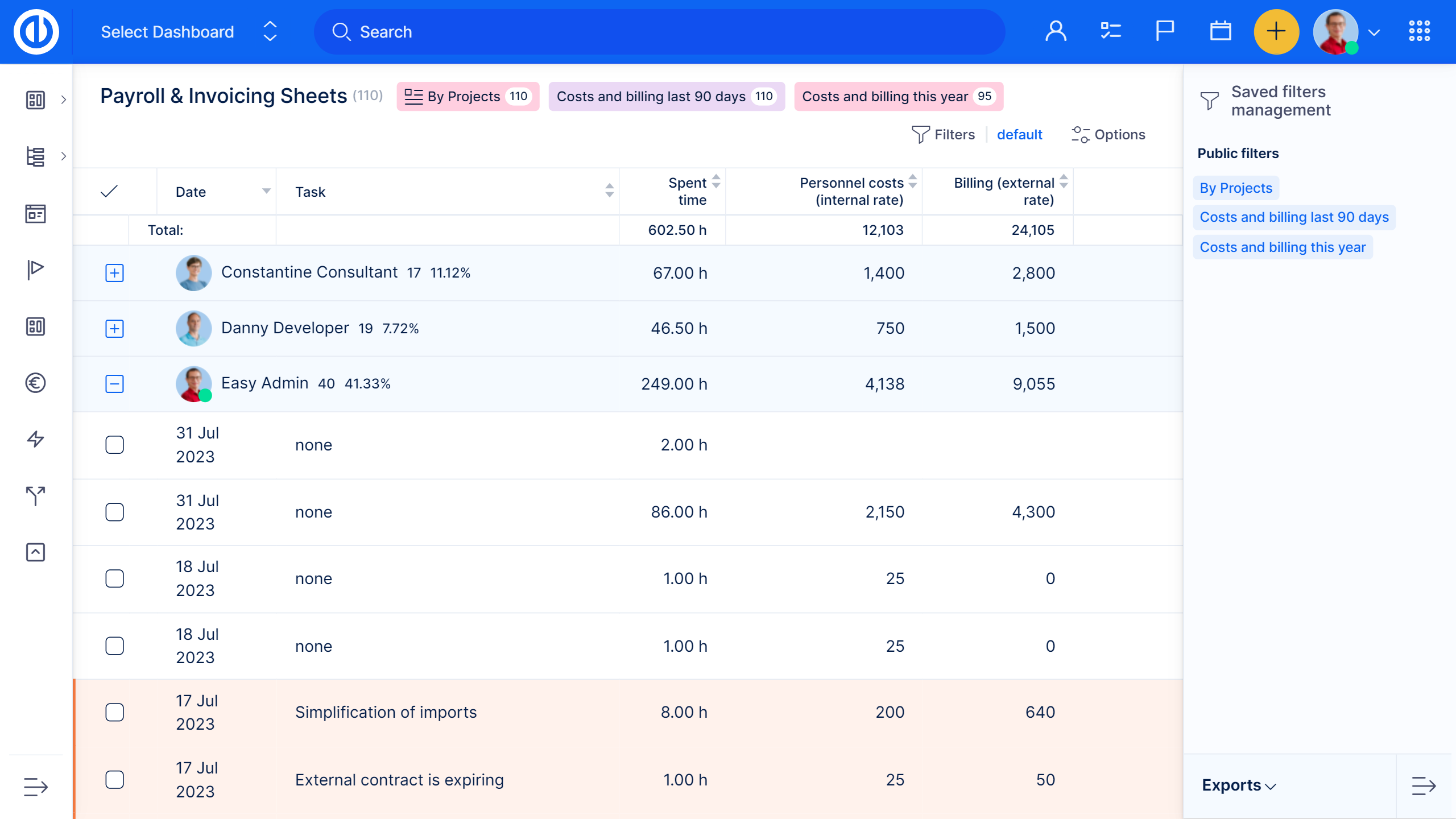 Dieses Plugin enthält Projektzeiten, multipliziert mit Stundensätzen. Filteroptionen und interne / externe Stundensätze ermöglichen einfaches Erstellen von Rechnungs- und Lohnlisten. Die Integration mit CRM und Kontakte Plugins ermöglicht es, Markenrechnungen in PDF, XLSX oder CSV direkt von Easy8 an den Kunden zu senden.
