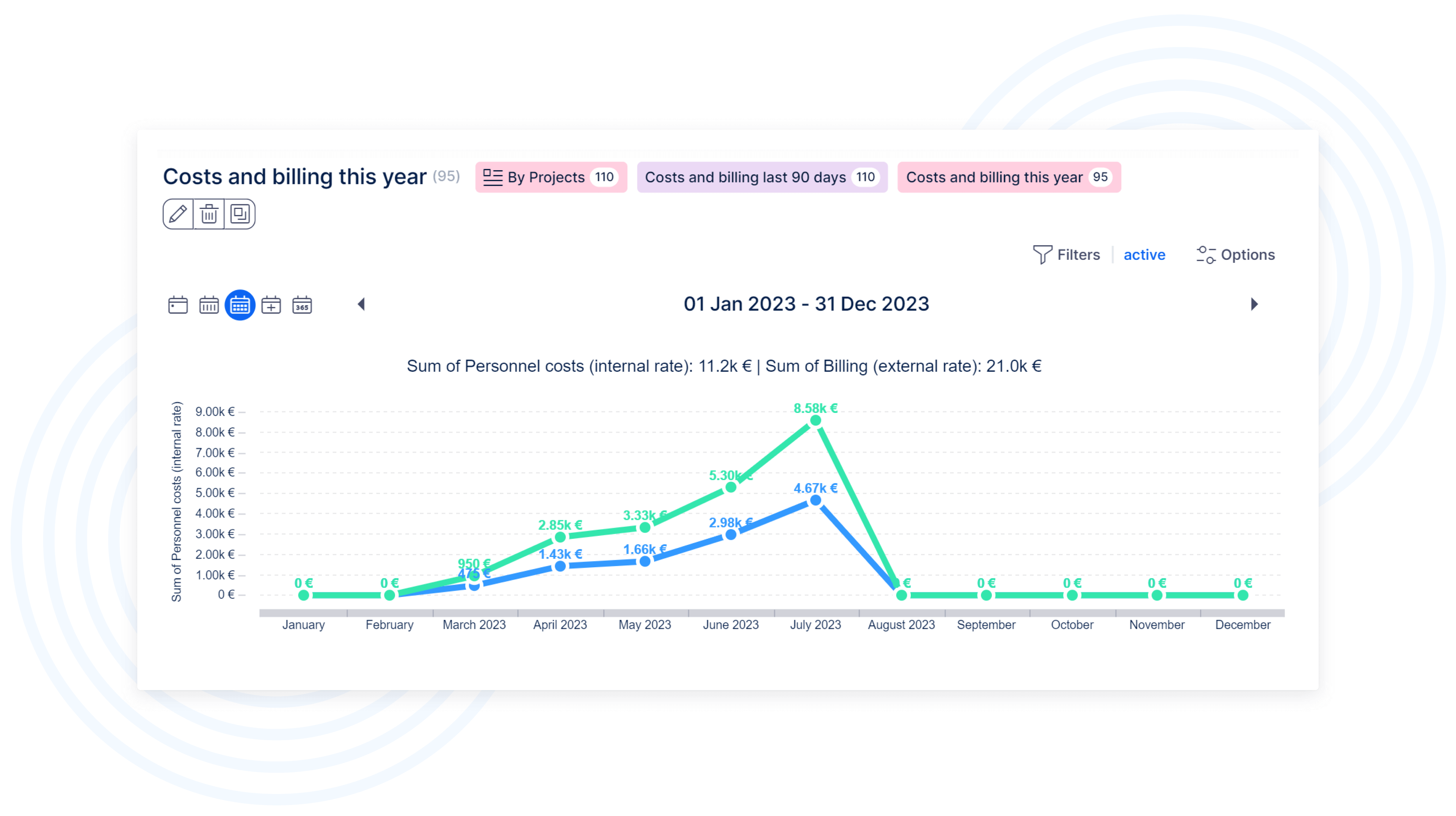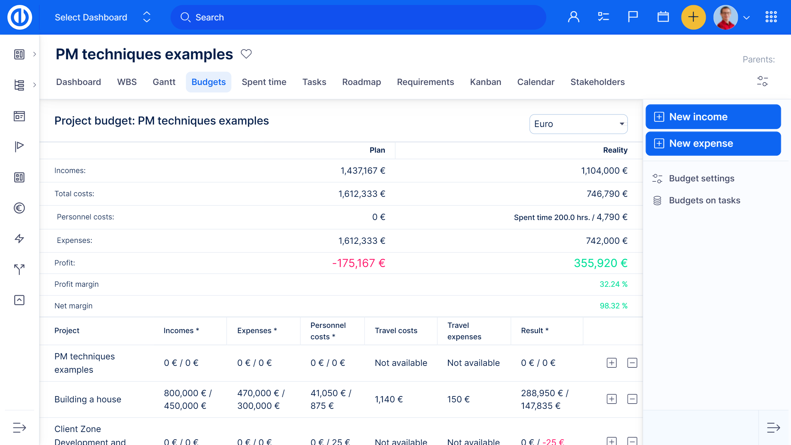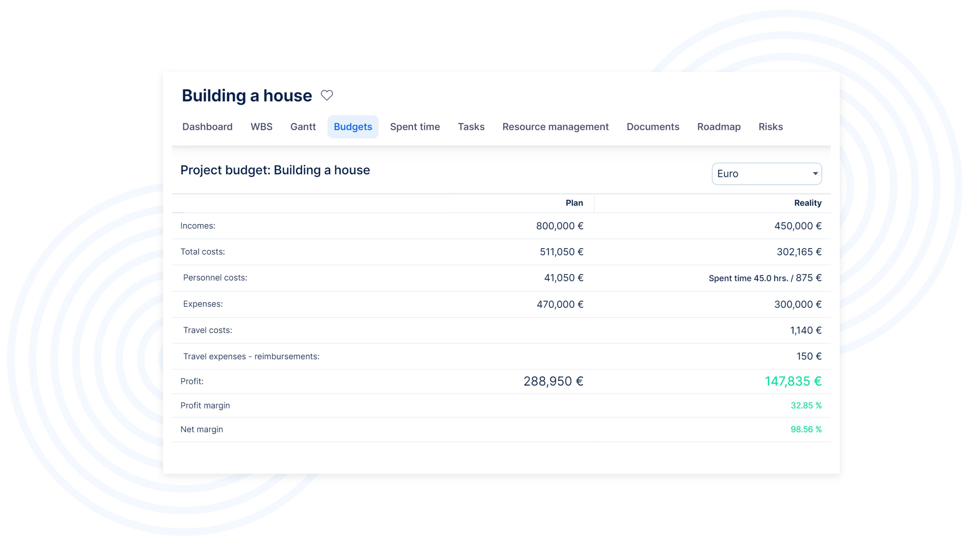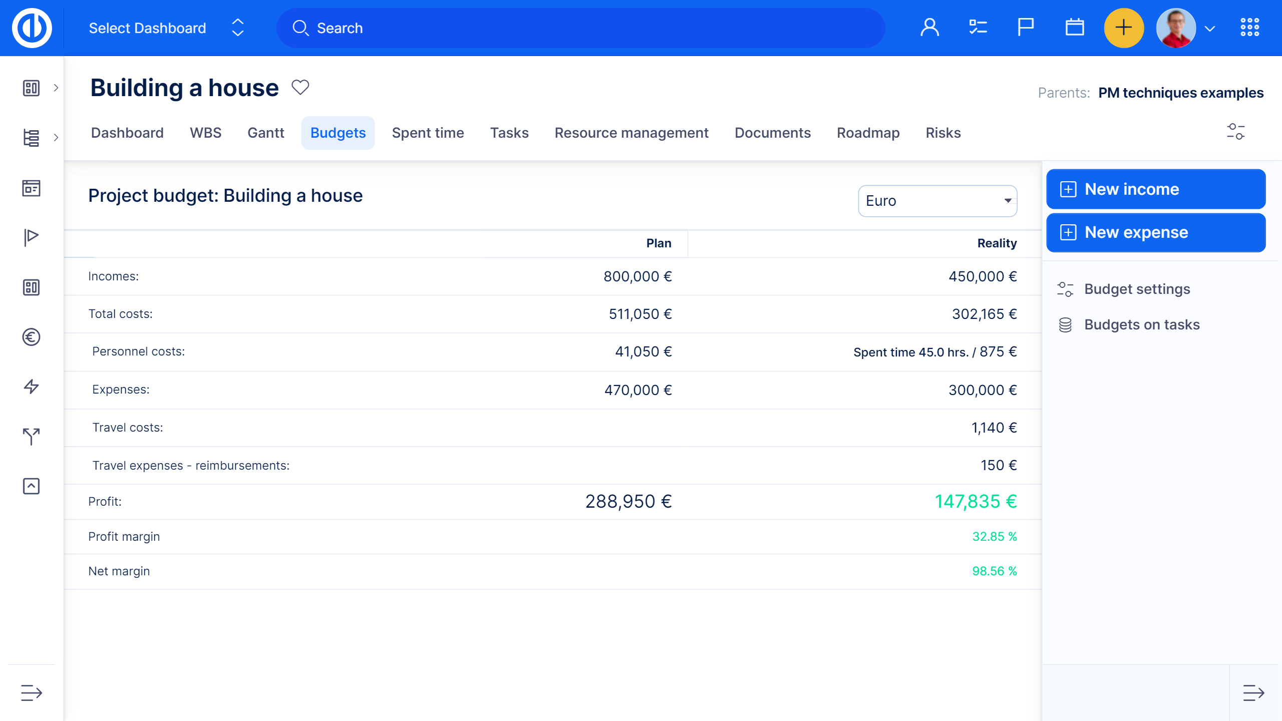 Es ist ein Plugin, das Einnahmen, Kosten, Lohnkosten und den finalen Gewinn des Projekts überwacht. Zudem können Sie Echtgeldeinträge im Kontext mit dem definierten Plan überwachen und die Gewinn- und Verlustrechnung der Projekte.