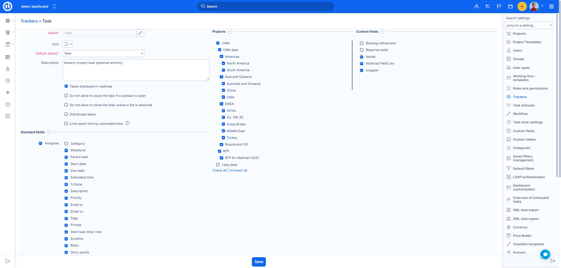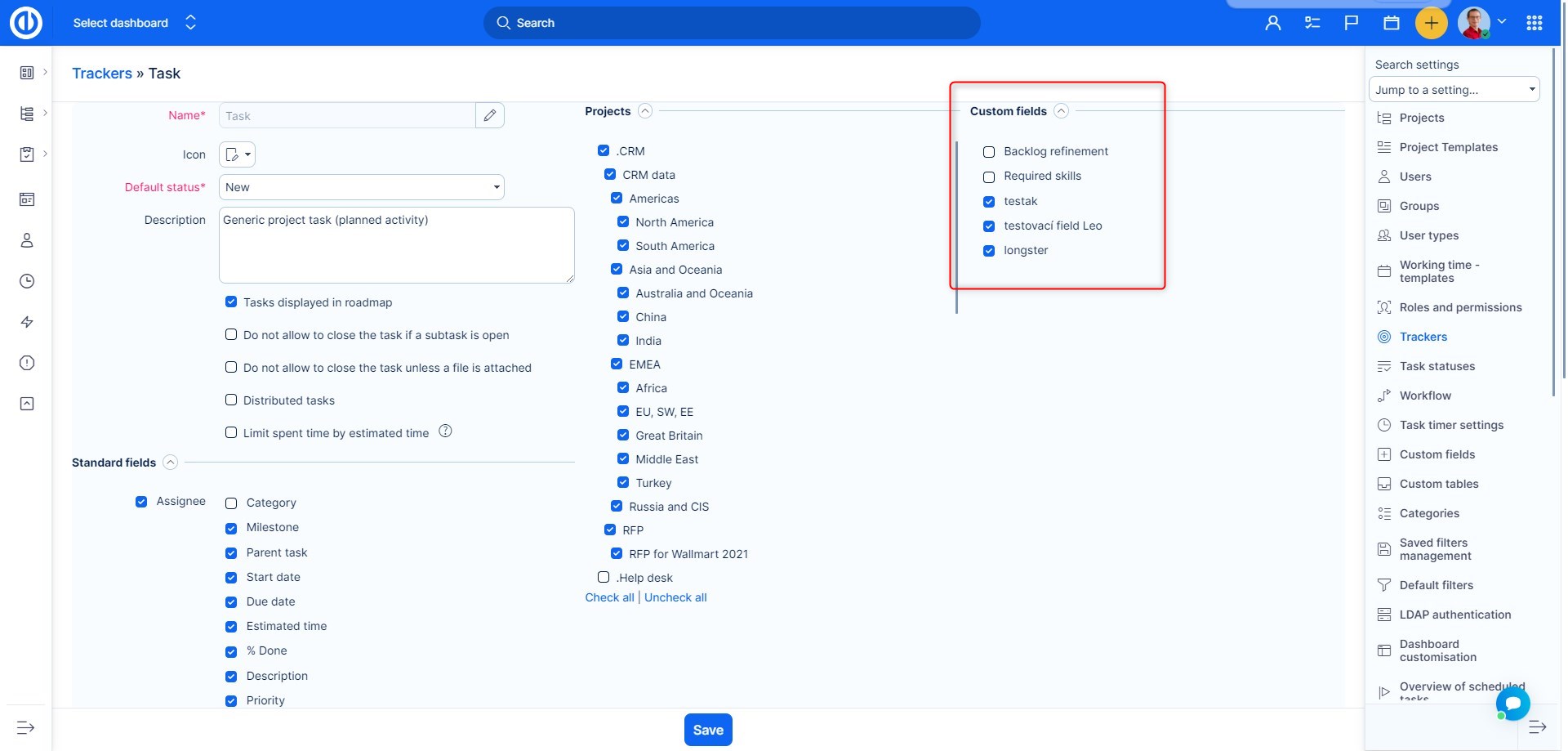• If you are trying to add a task type to a project (via Administration >> Task types >> new/edit), the selected projects must have all required custom fields filled in. Otherwise, you will get an error message that some projects are invalid. We recommend setting all project custom fields as not-required when you are adding task types. Once you have all task types added, you can set the custom fields as required again.