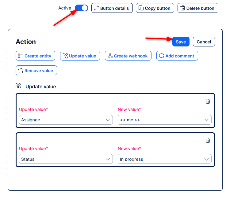 A button is shown on the detail of an entity, e.g. a task. User clicks on it, and it performs pre-defined actions, such as: