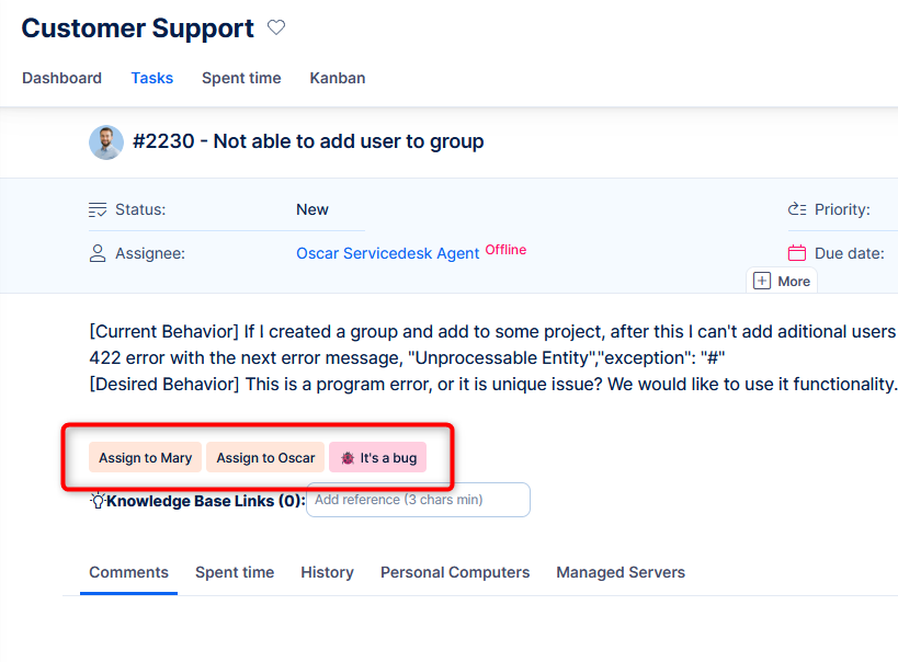 - Write to comment: This Top priority task is unassigned, please reevaluate the priority, or assign to someone to resolve it.