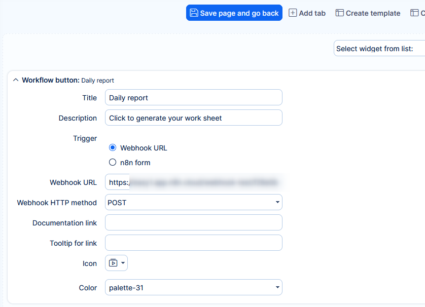 Available on any dashboard. Clicking it will trigger a POST webhook, or open an n8n input form.