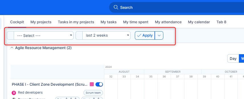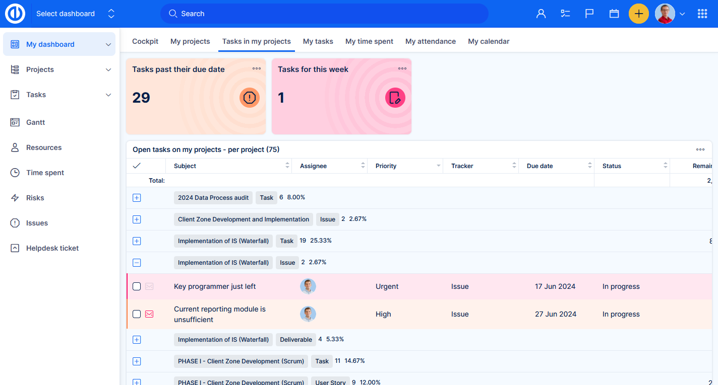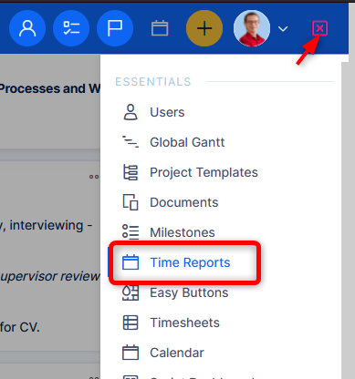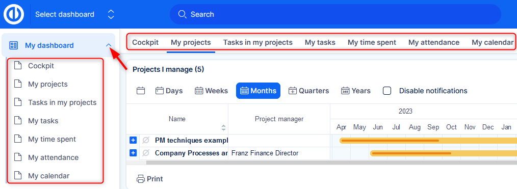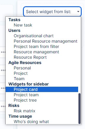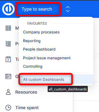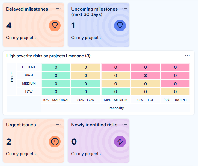 - Feature dashboards - these are tied to a specific area (feature) of the application, such as time tracking, budgets, risk management, and many others. They are mostly accessibly through the global menu (top right corner)