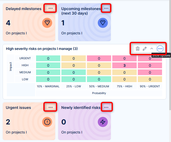 If you are administrator or have proper permissions, you will find three dots at the top right corner of every widget. By hovering mouse over it, options for the widet will appear. Every one has edit and delete buttons. Others may have specific buttons (collapse/expand, chart baselines).