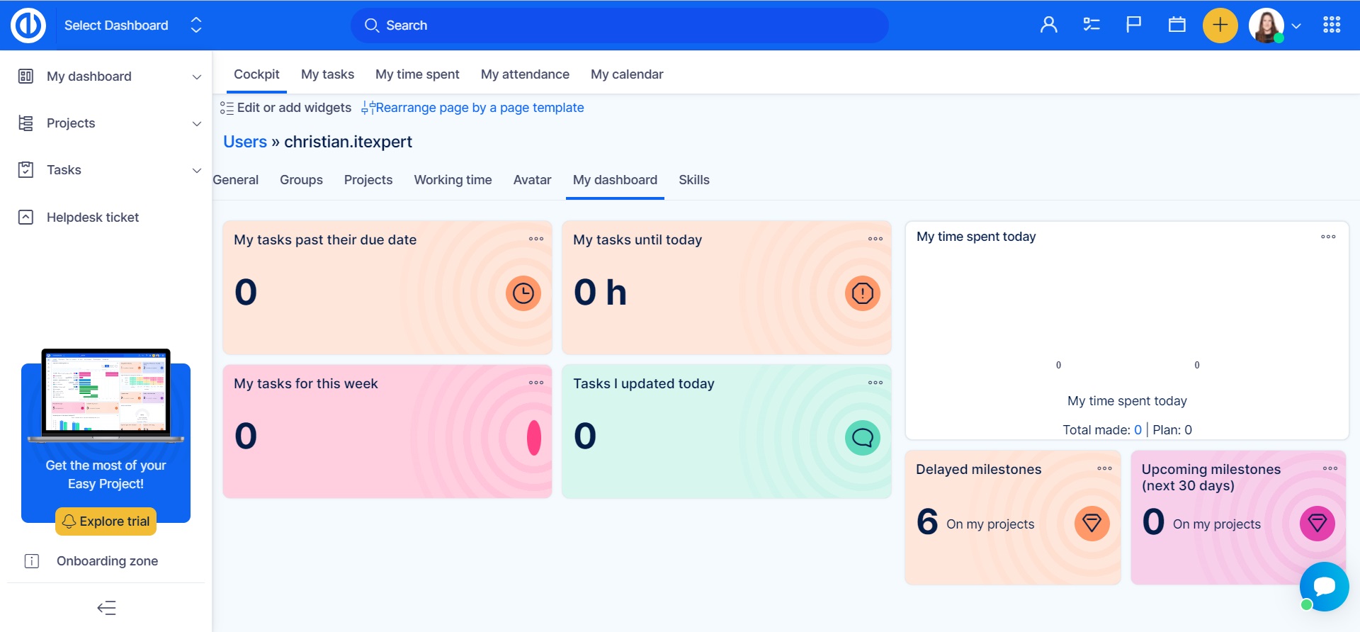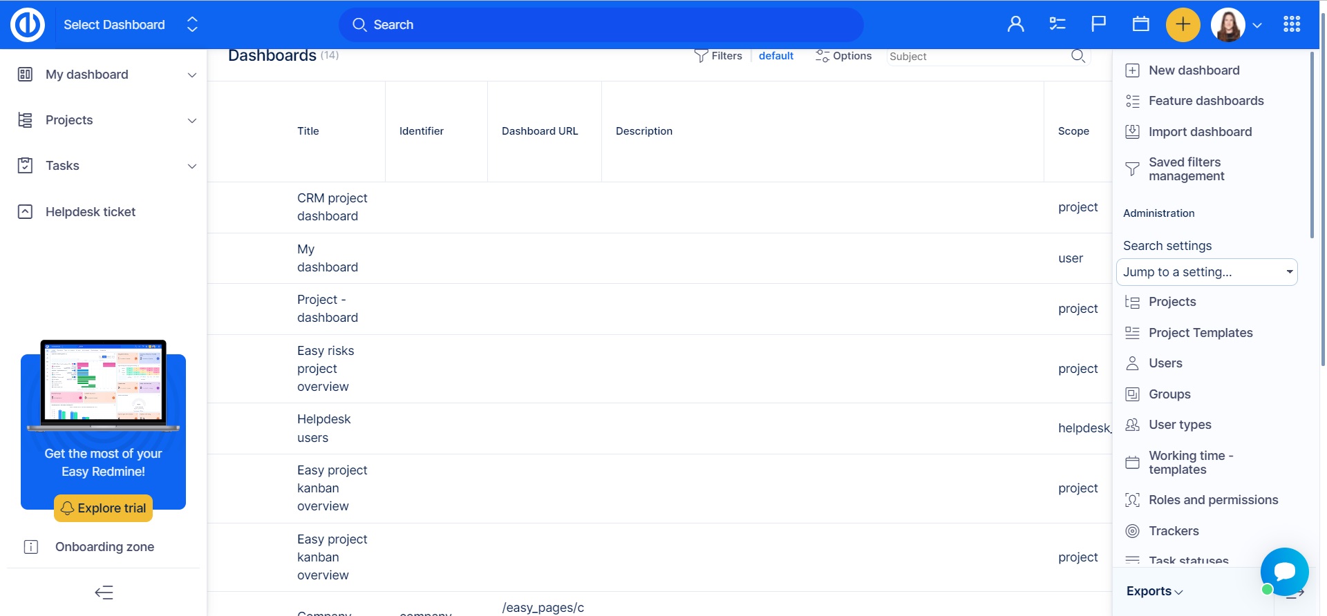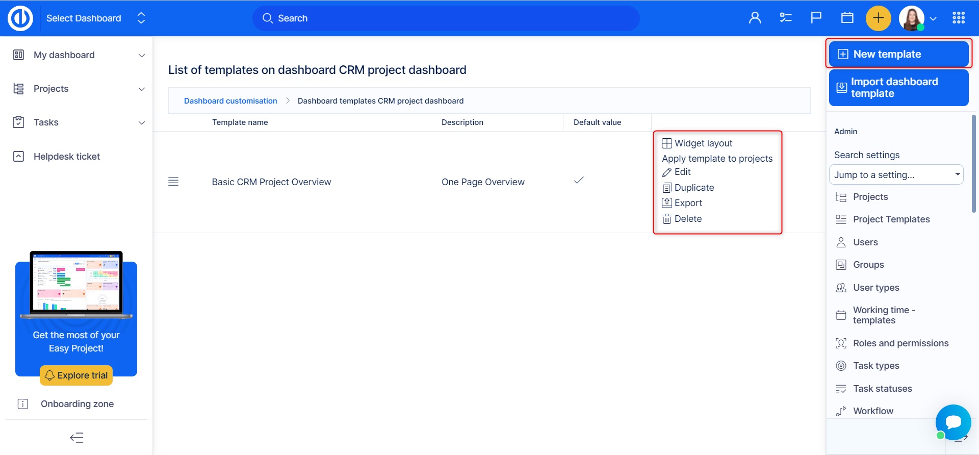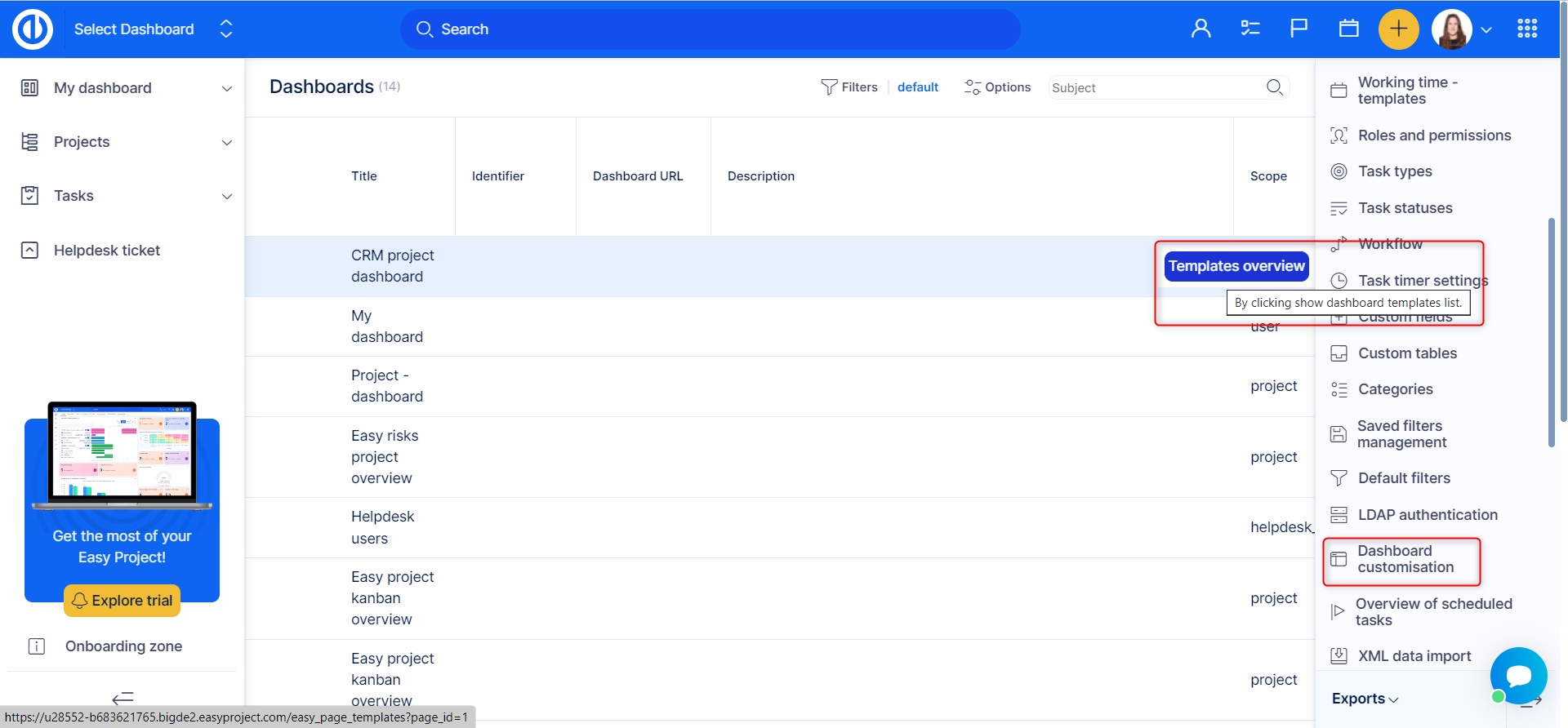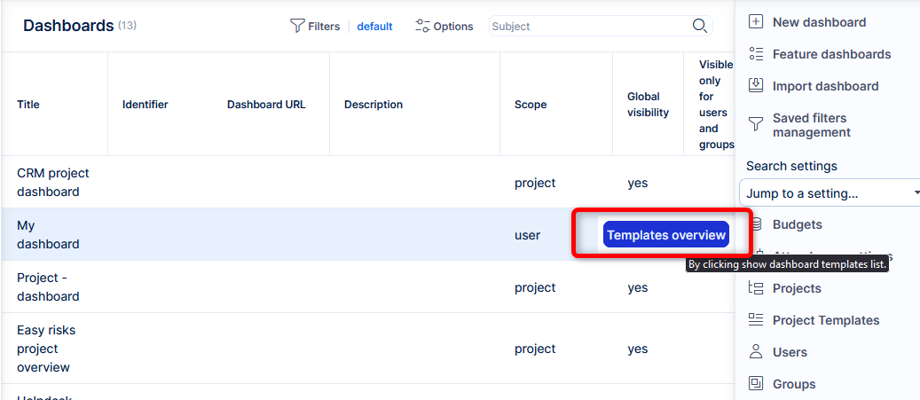 Go to More >> Administration >> Dashboard customization. On the main page, you see a list of templates for My dashboard (your personalized homepage), Project - homepage, and CRM project overview. To start working with templates, select one of these entities and click on the green button "Templates overview" on the left side.