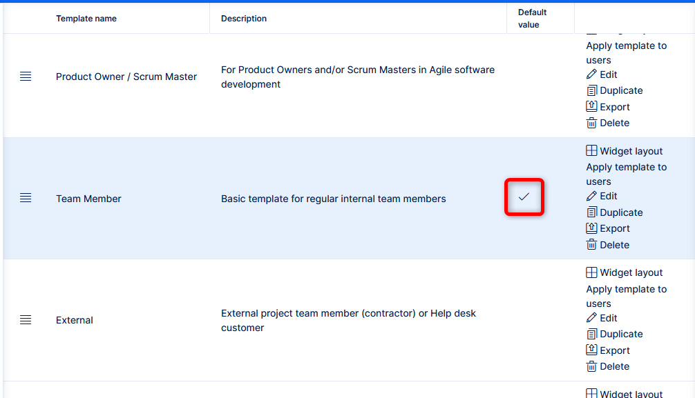 The template which is set as default is automatically preset for new users (unless you choose to change it during user creation), or projects (unless they are created from a project template).