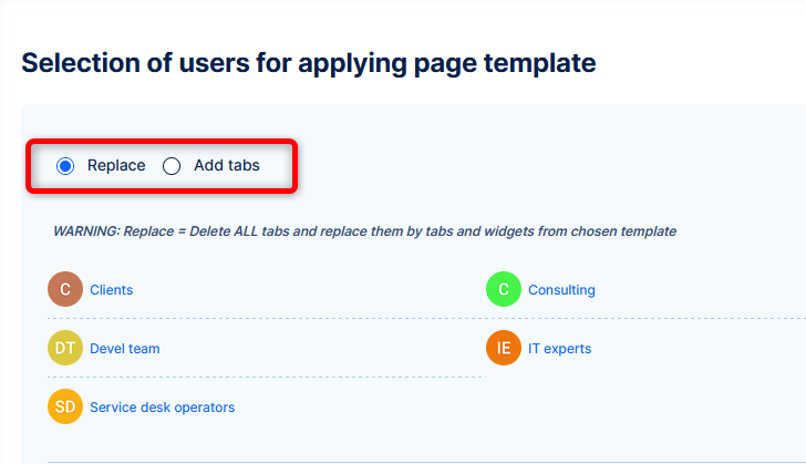 Just aware that applying the dashboard by replacing their previous one, users/projects will lose all of configuration that was made directly on their dashboard. This is not a problem, if the users are not allowed to edit their dashboard. The less invading option is to apply the template by adding tabs. It makes sense when you want to add some new dimension to the dashboard. But of course, it is not sustainable for regular dashboard adjustments, unless you set a process for deletion of obsolete tabs.