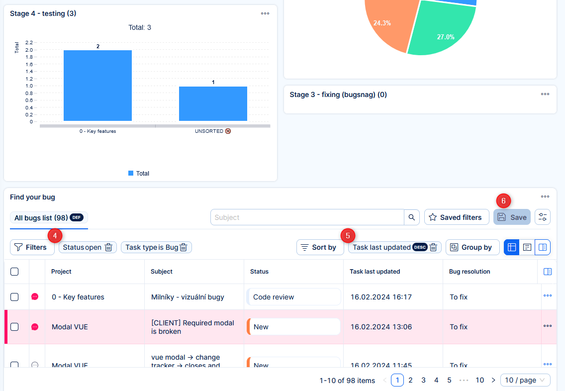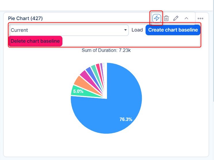 Baseline is a convenient chart-related feature for saving the continuous development (changes) on pie, bar or line charts. It is indicated by a lightning icon visible in all chart widgets added to any customisable dashboard. By clicking the icon, a drop-down list of existing baselines appears together with two buttons. To create a new baseline, click on the "Create baseline" button and refresh the page to make it appear in the list. To load an existing baseline, just select one from the list and click the "Load" button. To delete a baseline, click the Delete button next to the Create button.
