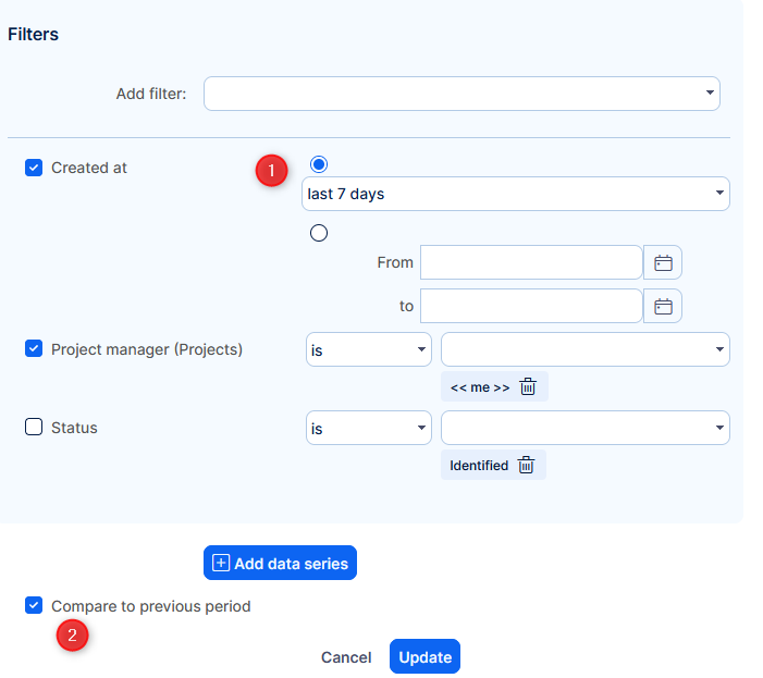 - When global filters Date and Date (from-to) are both created and applied on the same tab, the Date filter prevails over Date (from-to). Therefore, it is recommended to create Date (from-to) global filter on a separate tab to prevent the conflict.