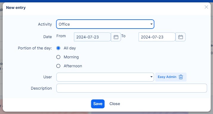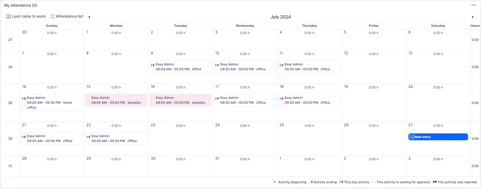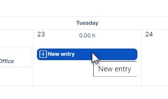 With the button " I just came to work" you will trigger a pop-up, where you can select activity, user and time of start and end of the working day. In calendar view, each day will give you option to add "new entry" .
