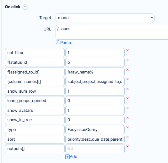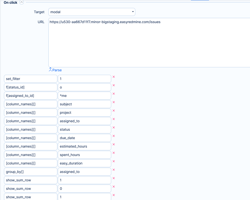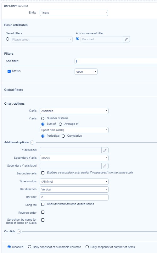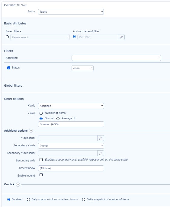 Any kind of graphs and charts added to a personalised dashboard can be configured to show a specific page (so-called "dimension") when a user clicks on the chart values. This page is displayed based on manually entered URL address, which can be found in the module configuration under "On click" section. In the "URL" field, enter the address of the page to show on click. If the URL address is located on the same domain, you may enter it without domain name such as "/projects" instead of "www.domain.name/projects".
