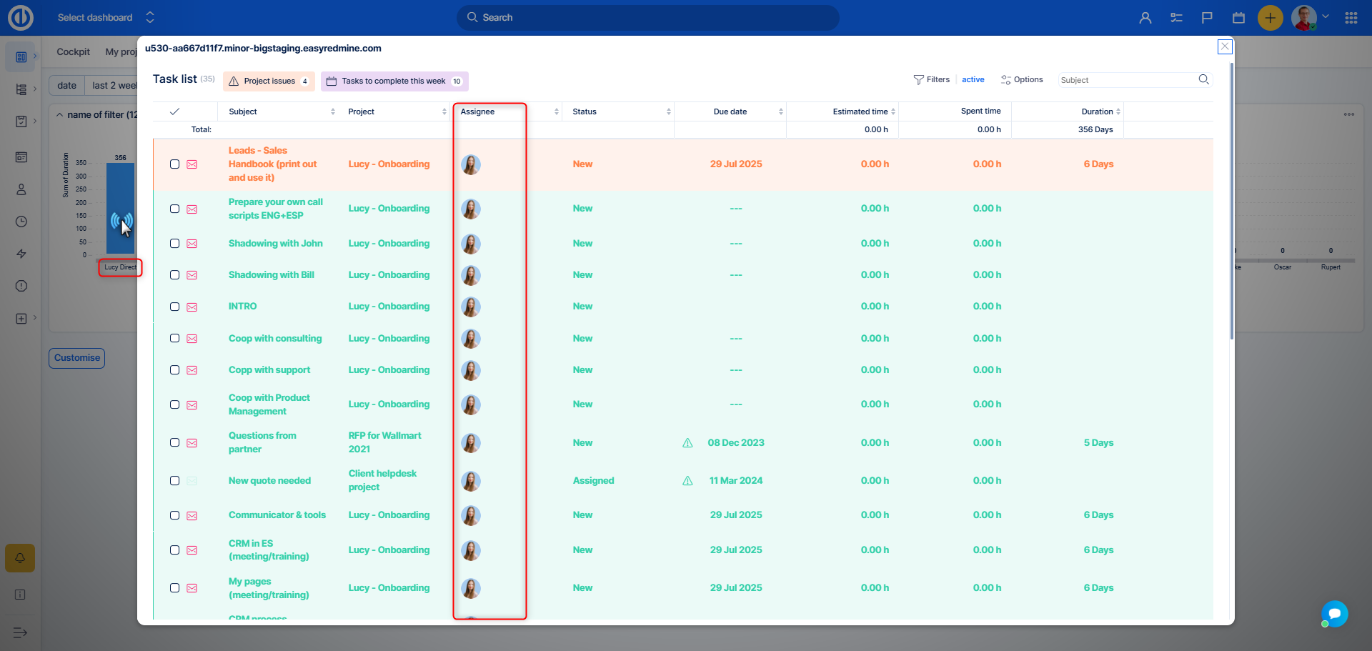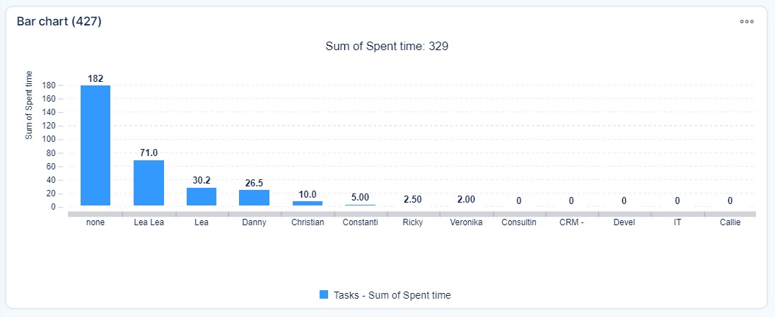 The result will look like this: A bar chart representing tasks per assignee. By clicking a bar that represents a specific user, a Quick View will appear showing only that person's tasks within the applied filter.