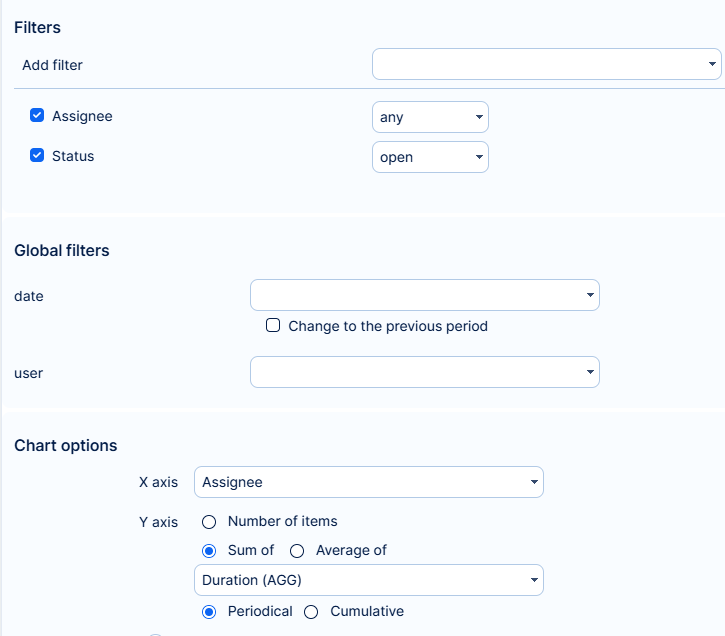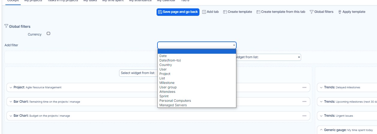 You can filter by the following criteria: Date, Date (from-to), Country, User, Project, List, Milestone, User group, Attendees, Sprint, And you will also find Assets from the Assets and Configuration management plugin (For example Computers, Servers)