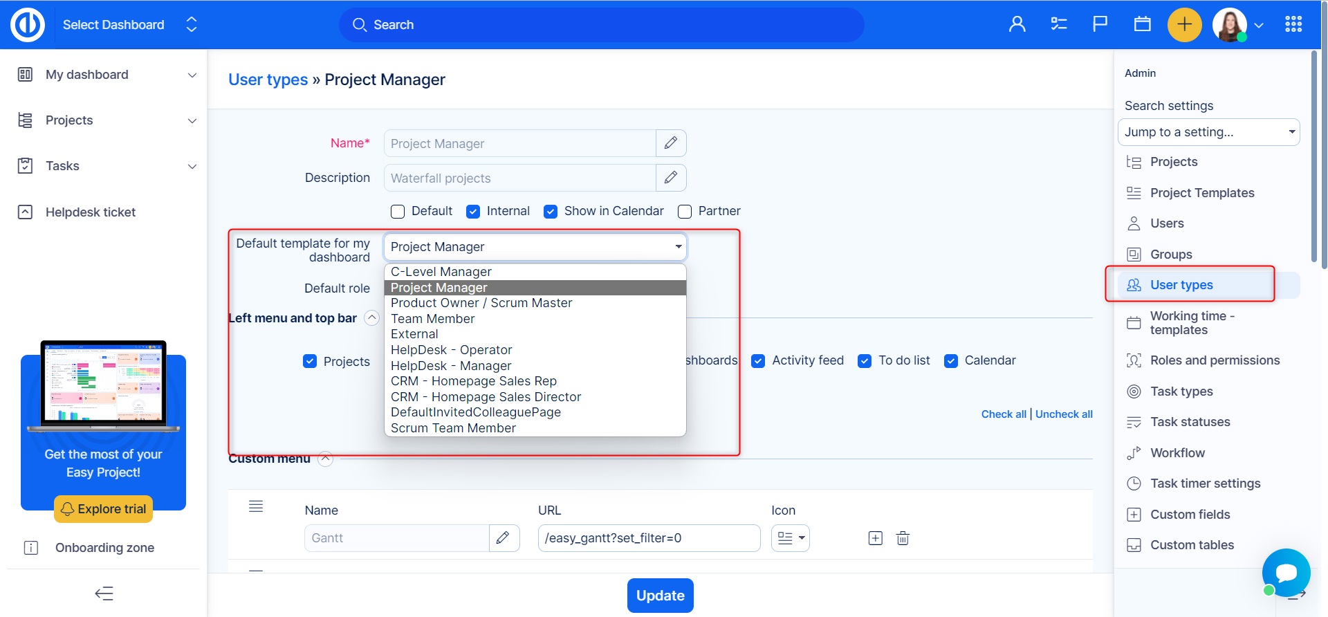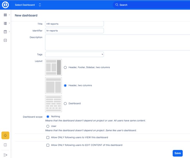 Moreover, in Global menu >> Administration >> User types - Default template for my dashboard, you can simply link a dashboard with a particular user type so each newly created user account of that user type will have this custom page predefined by default (see below).