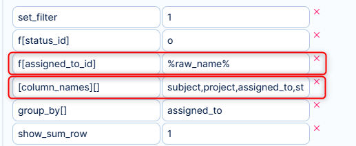 Edit thevaluekey for segment selection. In our case, it isf[assigned_to_id]. Change the value to%raw_name%. Additionally, add the column names (comma-separated) into one multiple-value field: