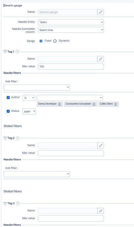 - Tag #: Generic gauge may contain up to 3 tags, which basically means 3 different generic gauges in one widget with the possibility to quickly switch in between like tabs in your web browser. For each tag, you may enter a different name, needle filters and range filters, while other settings are common for all the tags.