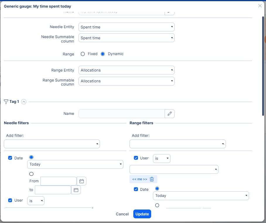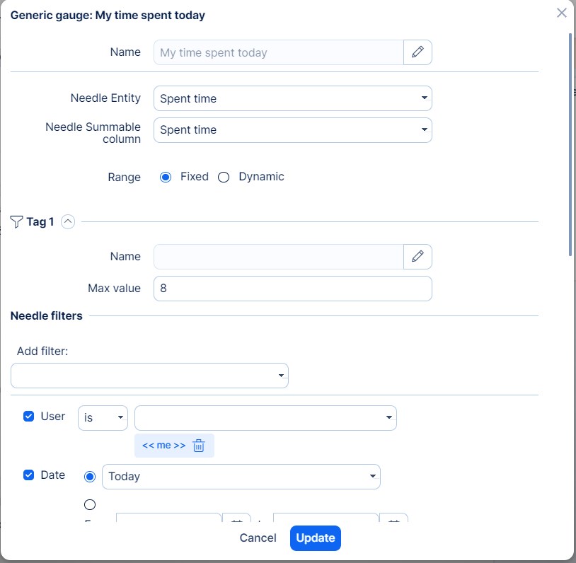 To set this widget for this purpose, select Generic gauge from the list and set Spent time as the needle entity. You will find two options to set the Max number of the gauge: Fixed and Dynamic.