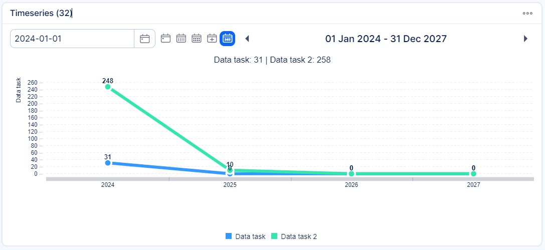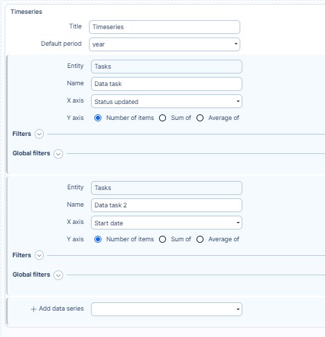 The best thing on timeseries is that you can view any number of various entities in one chart. For example, a total performance chart, containing the sum of story points on closed tasks, project incomes by date, number of closed support tickets, amount of billable service hours, the total value of billable service hours, etc. Just think of the possibilities.