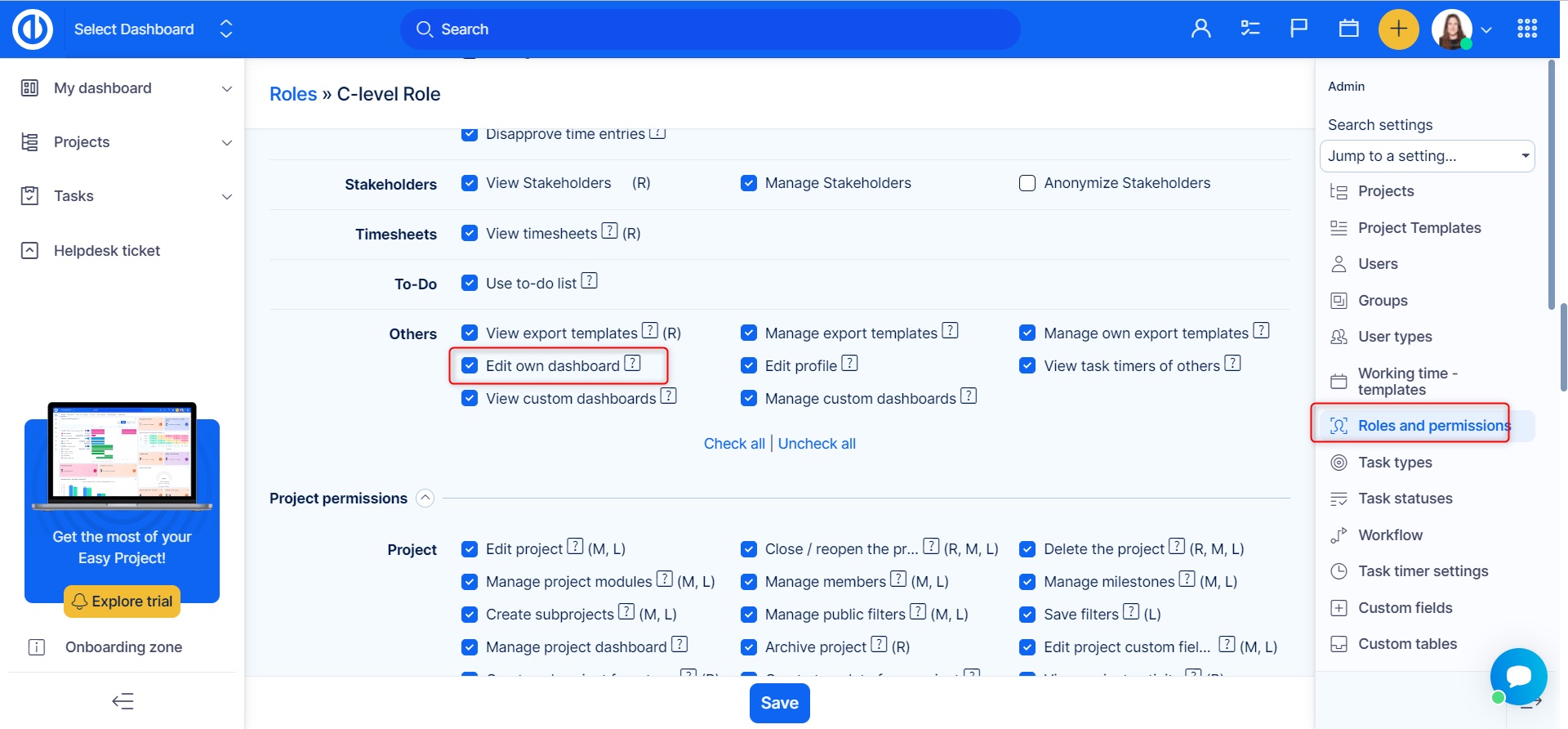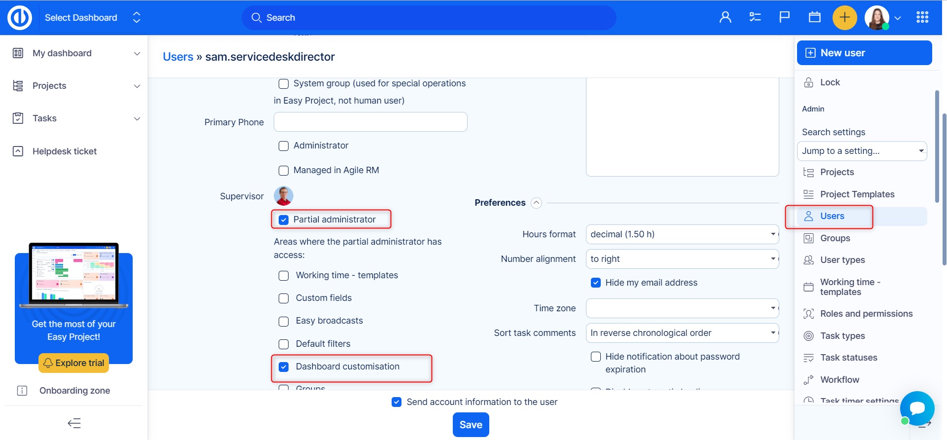 Only administrator and partial administrator for "Dashboard customisation" area are allowed manage the feature in terms of creating or editing dashboard templates and applying them to user accounts. This permission can be given to a user on his user account (see below).
