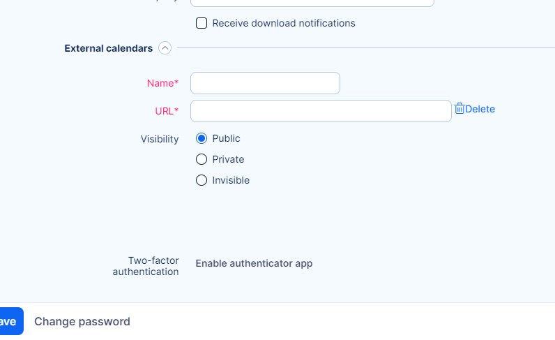 - In the Calendar settings find the field for exteral calendar. You will find here all external calendars connected to your account. Select the calendar and save the settings.