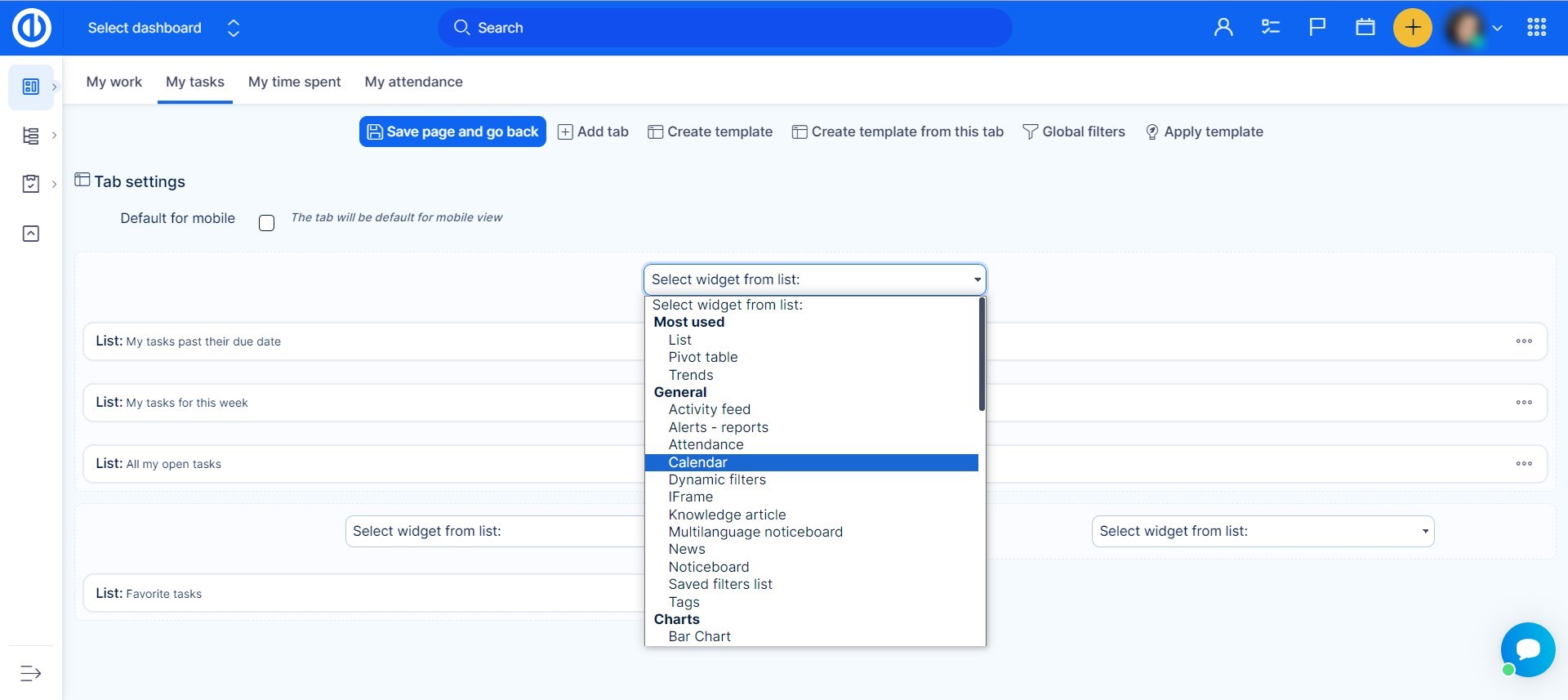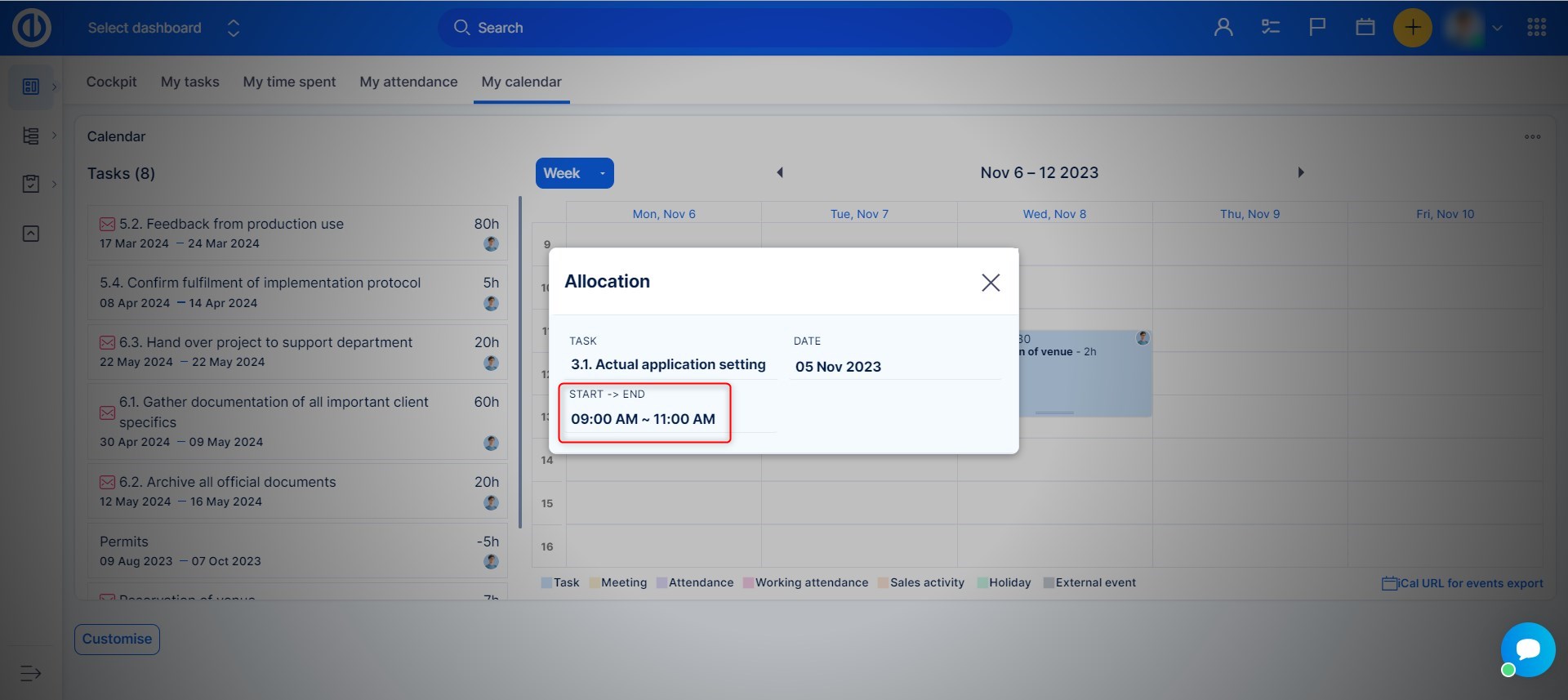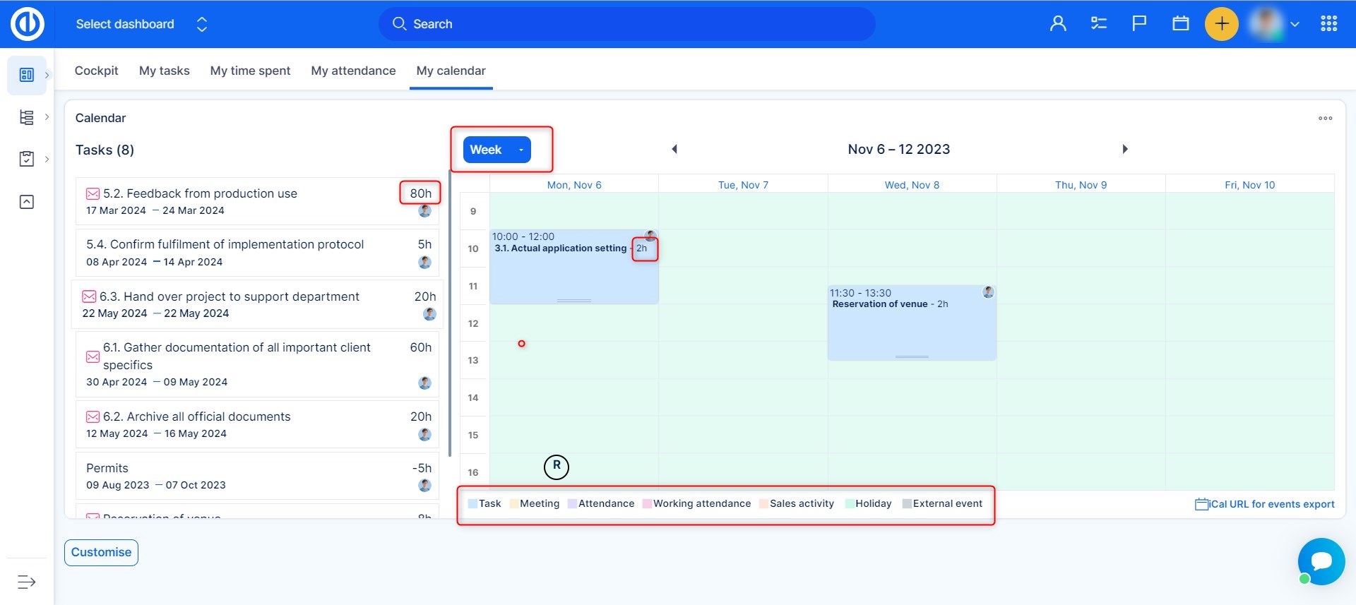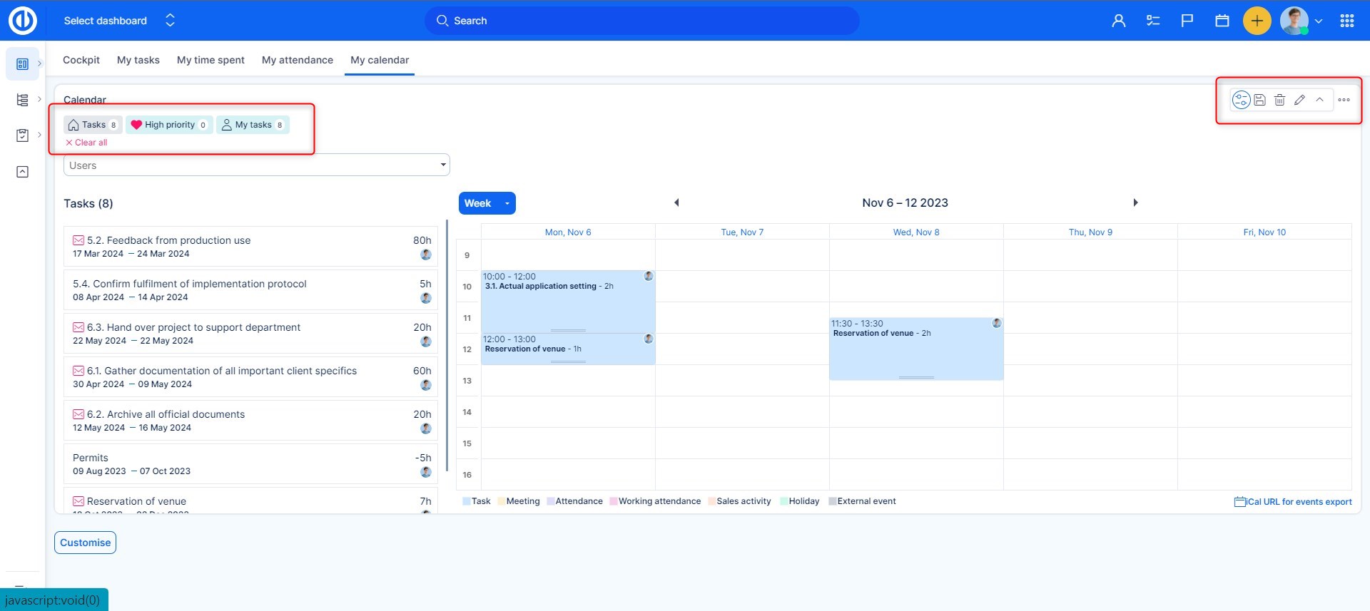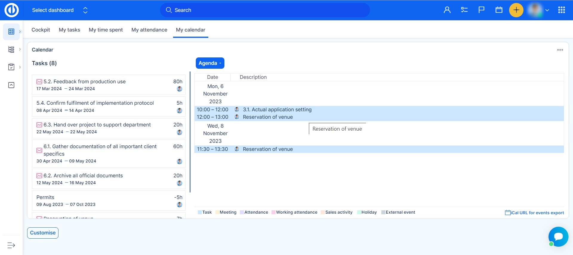 Calendar plugin is a drag and drop calendar that shows all meetings, to-dos, planned resources, attendance, and spent time entries. It's quickly becoming the most used plugin by our clients because it gives an ultimate and instant overview of what is going on to both regular workers and managers. Calendar can be added to any personal dashboard, such as your homepage. To add Calendar on your homepage, project page or another personalized page, just go to page edit mode ("Customize this page" button), add a module called "Calendar" and save the page. Alternatively, you can open it instantly by clicking the calendar icon in the upper bar of your application.
