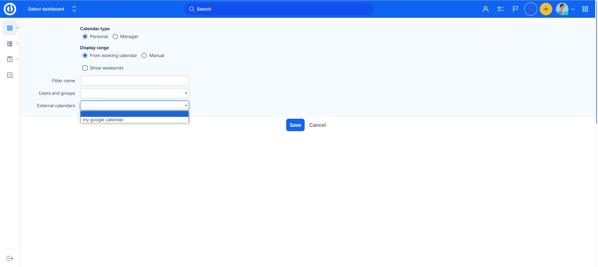 In the module configuration, you have the option to switch between personal and manager roles with different permissions. Just click on the pencil icon in the upper right corner of the module to open the settings window. If you are the Manager, you can simply select any user and assign task using drag and drop and thus use Calendar to optimally allocate resources of your team. If you select Personal, you can use Calendar to plan tasks in your own calendar only, not for any other users. Moreover, you can edit display range (including the option to show/hide weekends) as well as users and groups and filters right from here. In "Sort" options, you can set up the criteria of sorting tasks in the left column. To import a calendar, use the "Add external calendar" button in the lower right corner.