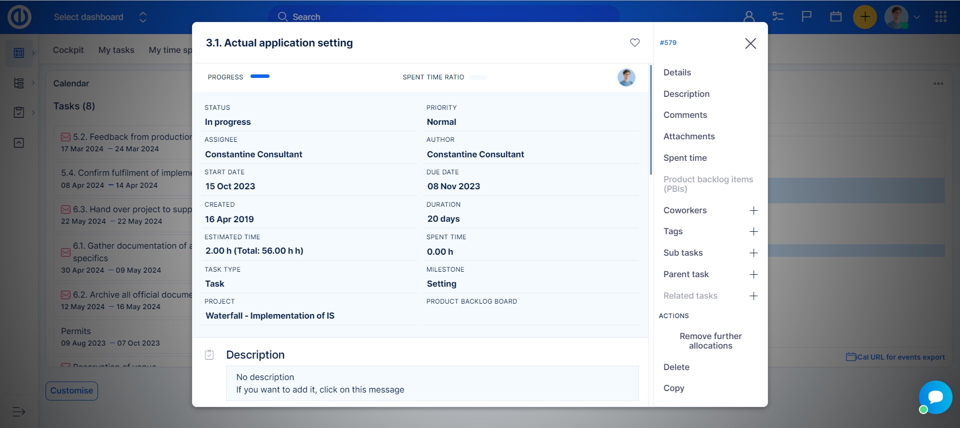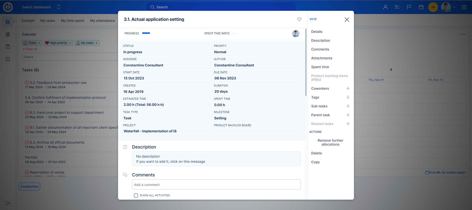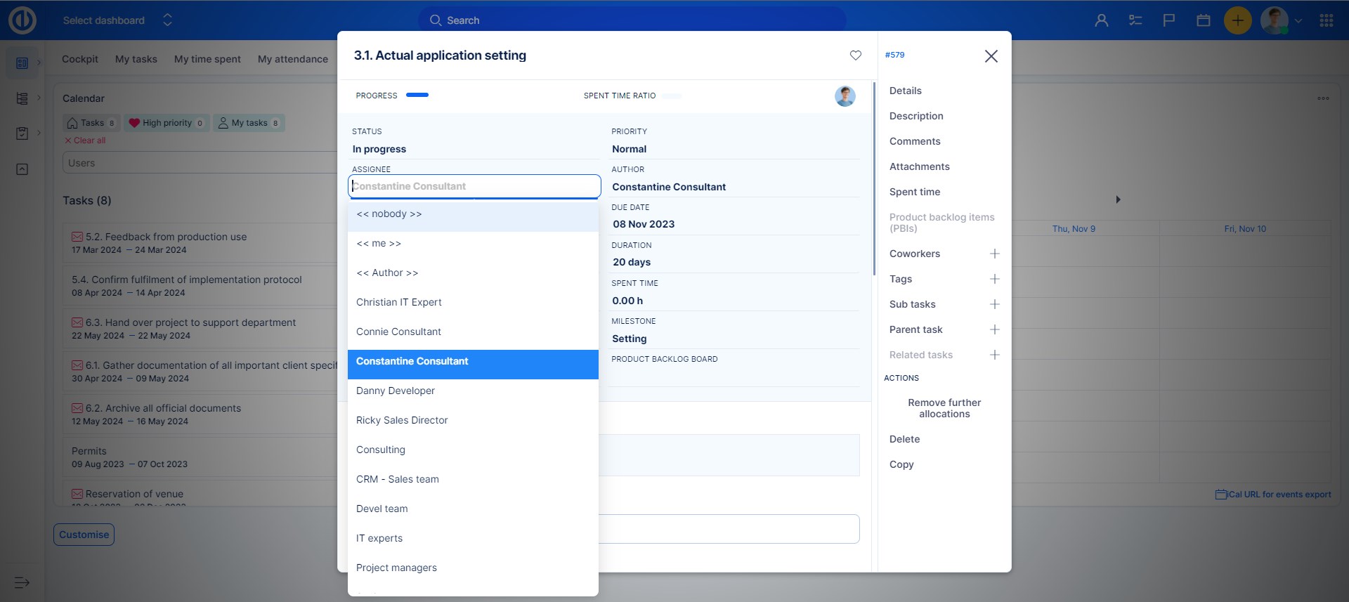 Just as easily you can also modify task attributes. Just click on a task in the calendar to show the Quick task editor. Here you can also log spent time, comment a task or delete a task from the calendar.