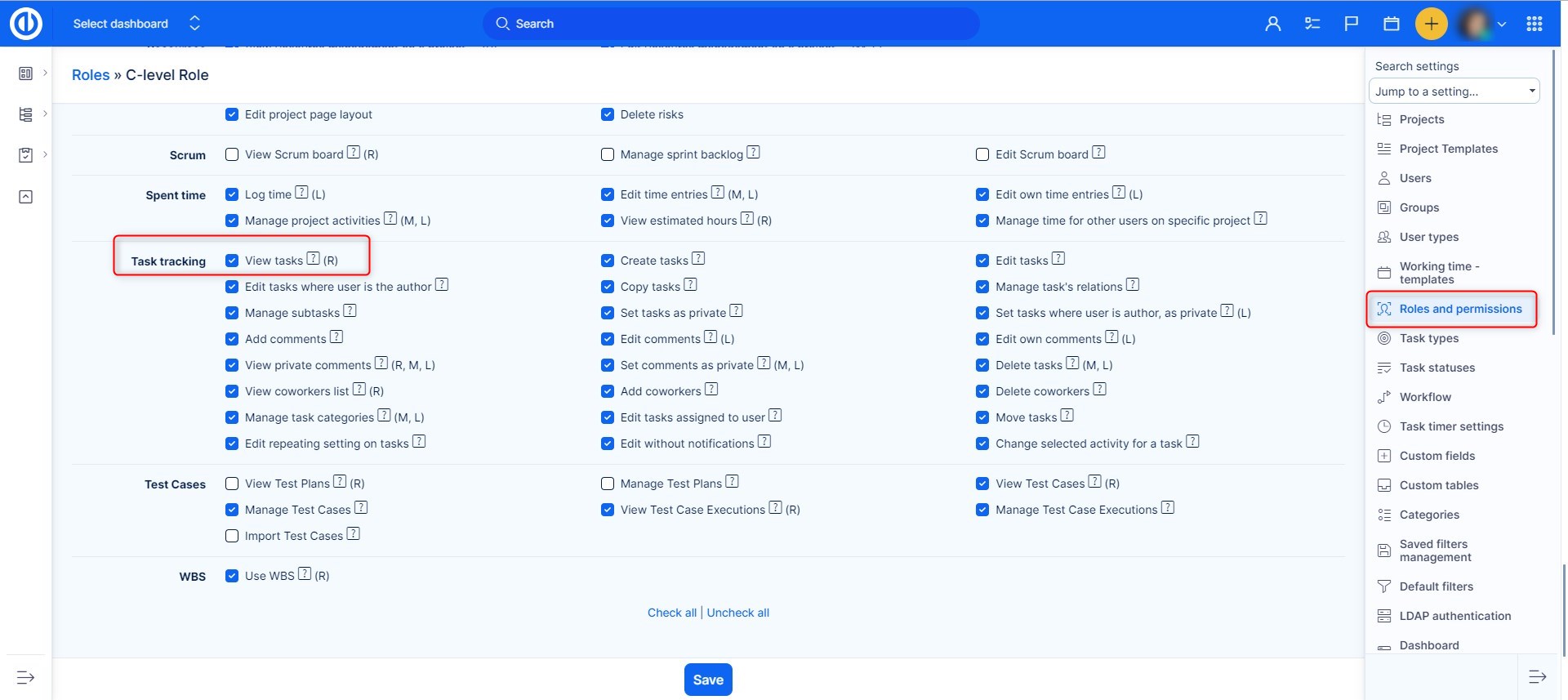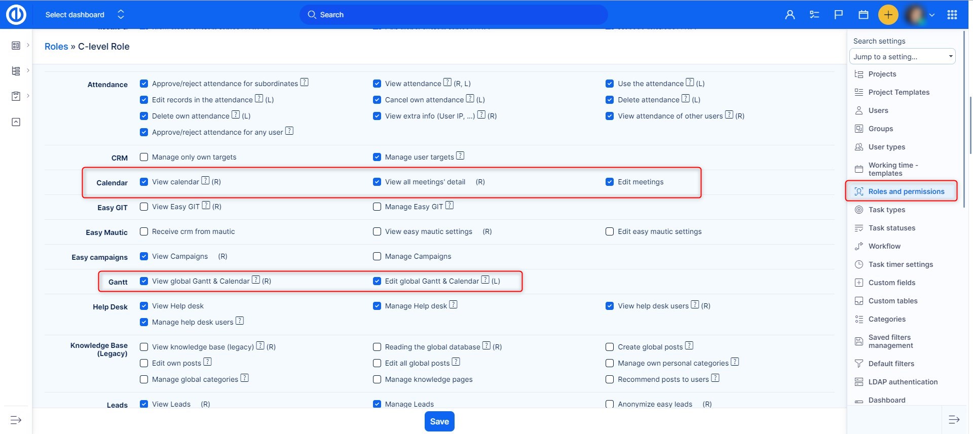 Roles and permissions of the plugin are common with those of Easy Gantt and Resource Management and can be edited in Administration >> Roles and permissions - select a user role - Easy Gantt & Resource Management & Calendar. Moreover, some permissions might be defined by workflow settings, such as that read-only fields cannot be changed from Calendar.