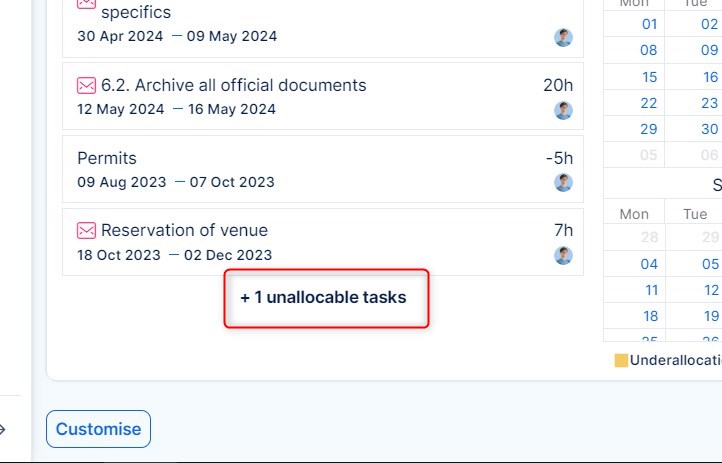 The list of allocable tasks does not intentionally display tasks that have their estimated time exceeded by spent time, which means they cannot provide any allocable hours and are therefore irrelevant for Calendar. These tasks are called Unallocable tasks and you can see information about their quantity directly below the list of allocable tasks.