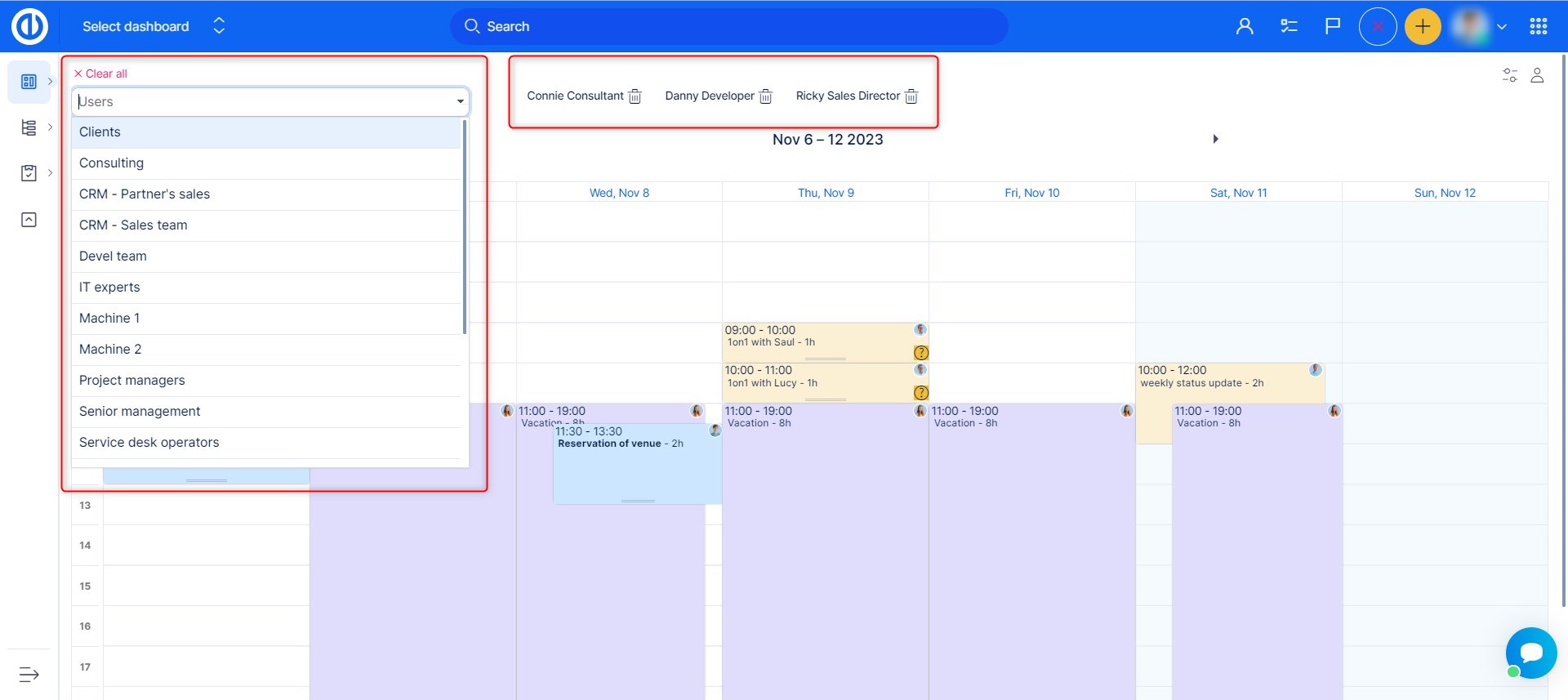 When you click the toothed wheel icon in the top right corner of the module, a drop-down list with the selection of users appears just above the task list, enabling you to easily add selected users to the Calendar by clicking on their names. The selected users appear right above the calendar in the form of named buttons. A single click on the button mark the user so that you can assign tasks to him. A double click will show only tasks, meetings, etc. of that particular user (like a filter). To remove a user from the selection, just click the trash icon beside his name. To activate a specific user, just click on the button with his name.