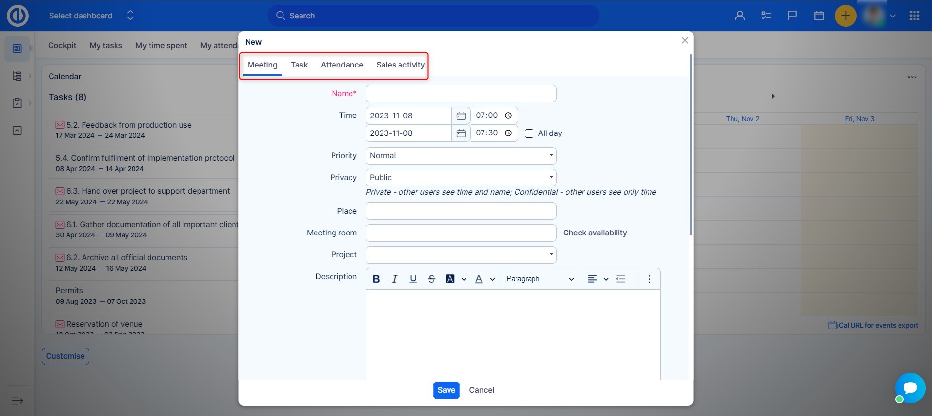 Calendar incorporates meeting calendar, which means you can easily create a new meeting as well as new task, attendance or activity right from here. Just click, hold and move the left mouse button on empty space of the calendar (for an intraday activity) or simply click on the specific day in the day/week view (for an all-day activity), then release the button and choose in the pop-up window what kind of entity you wish to create (meeting, task, attendance). When you schedule various kinds of entities (such as meeting + attendance) for the same time slot, it will result in 3 mutually overlapping boxes in the calendar view.