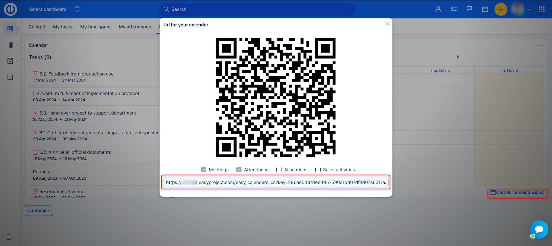 In order to export events or other entities from your Calendar to another iCal-compatible calendar, just click "iCal URL for events export" button in the lower right corner. This will open a pop-up window called "URL for your calendar" with the URL address just like a QR code containing the same URL address for quicker copy-paste. For each URL address, you may decide which entities should be included for export by ticking the respective checkboxes (meetings and attendance records are ticked by default, only tasks are optional). Then simply paste the generated export link into an importing field of the target iCal-compatible calendar.