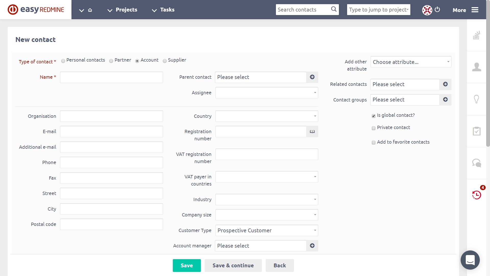 After clicking the New contact button, a form will open. It may look like this.