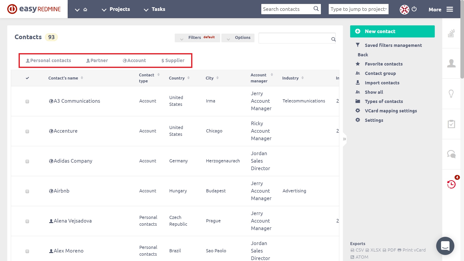 Now, when you are in the Contacts list, you are able to see all contacts in one place. You can filter them by type in the tabs above as shown in the picture below.