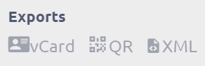 When you have a particular contact open, you can find Exports menu in the bottom right corner. By default, contacts can by exported into vCard (VCF file), QR code or XML. QR code is an easy way to add a contact to any device with QR code reader such as mobile devices (smartphones, tablets etc.).