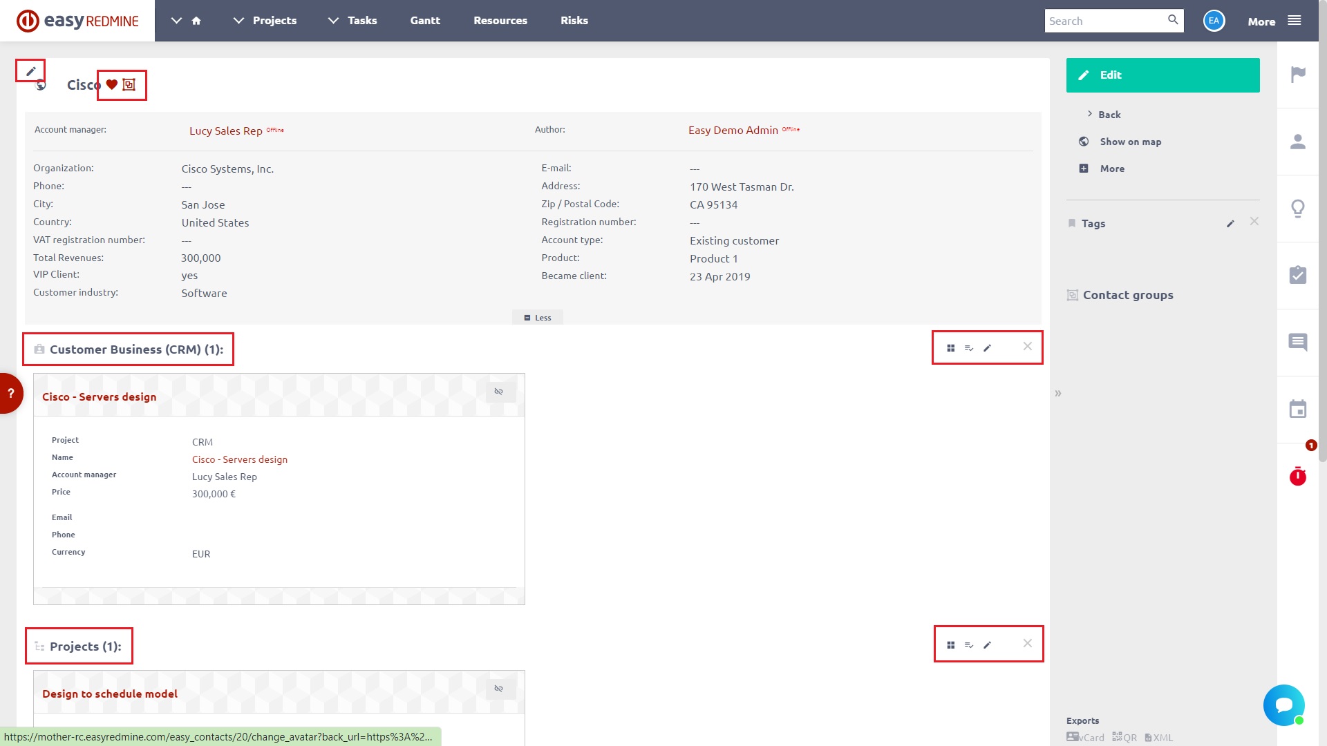 Now, when you open a particular contact, it might look like this. As you can see on the picture below, the contact is already linked with CRM case, project and invoice. To remove any of the connections, just click the unlink icon in the upper right corner of the particular entity. In the upper left corner of the screen there two little icons: a globe which tells you the contact is global and a pencil which you can use to change the avatar of the contact. In the upper right corner of the screen, you can find some additional information about contact attributes.