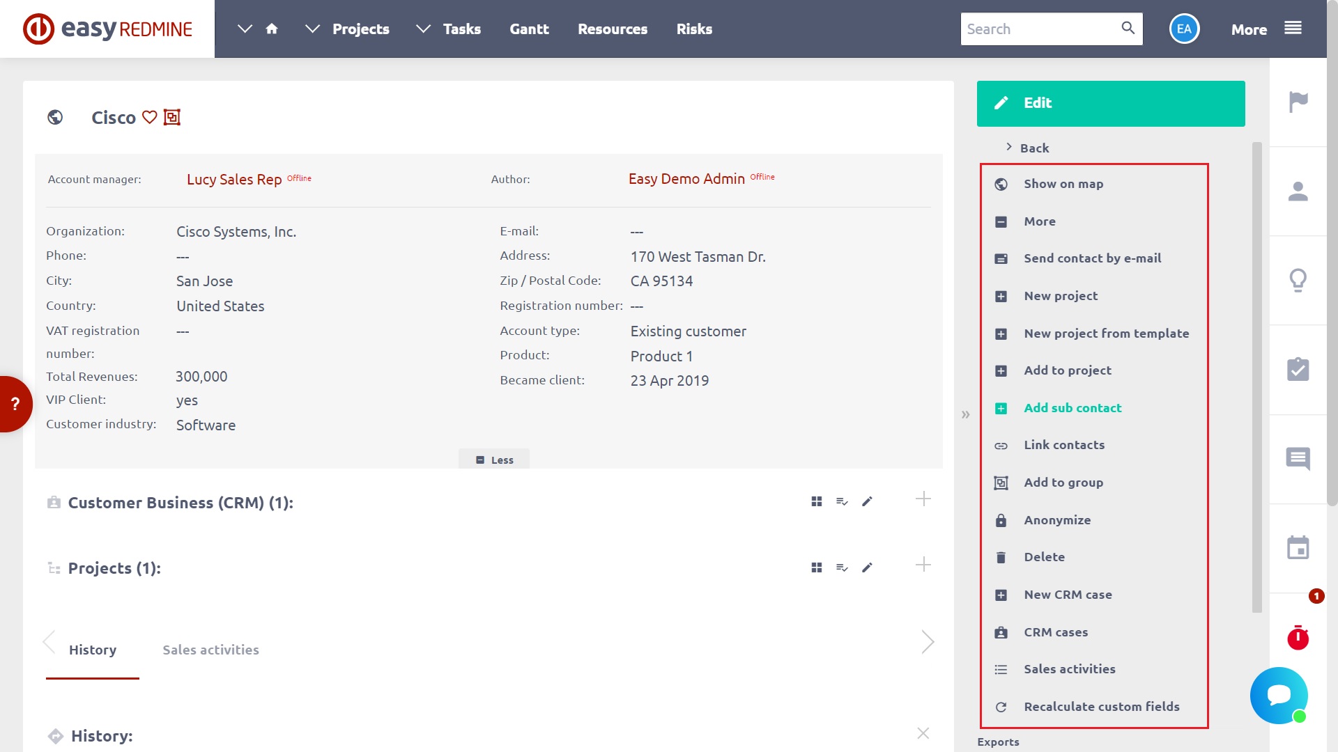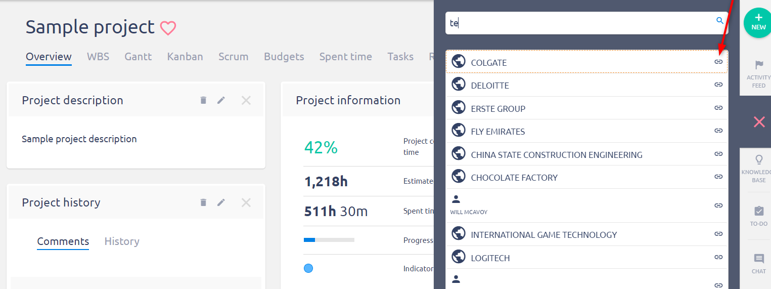 Moreover, you can link contact with a project. To do it, just open any project and simultaneously open the Contacts window from the right panel. Then simply search the required contact and click on the link icon next to it to add it to the currently opened project. The analogical way you can link the contact with a task, CRM case or invoice.