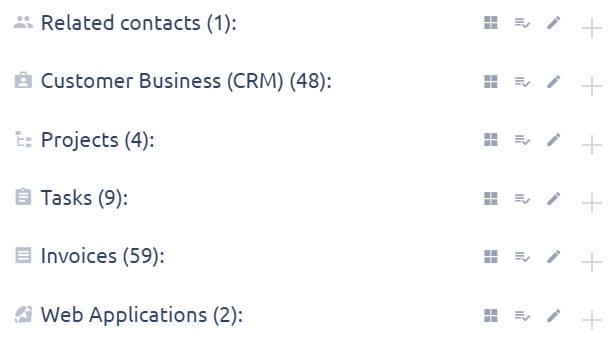 - Contacts on related entities (such as task, CRM case, project or invoice) can be displayed in two different views - as tiles or a list. The view itself cannot be saved/remembered and depends on the number of contacts (tiles view is used for fewer contacts than list view).