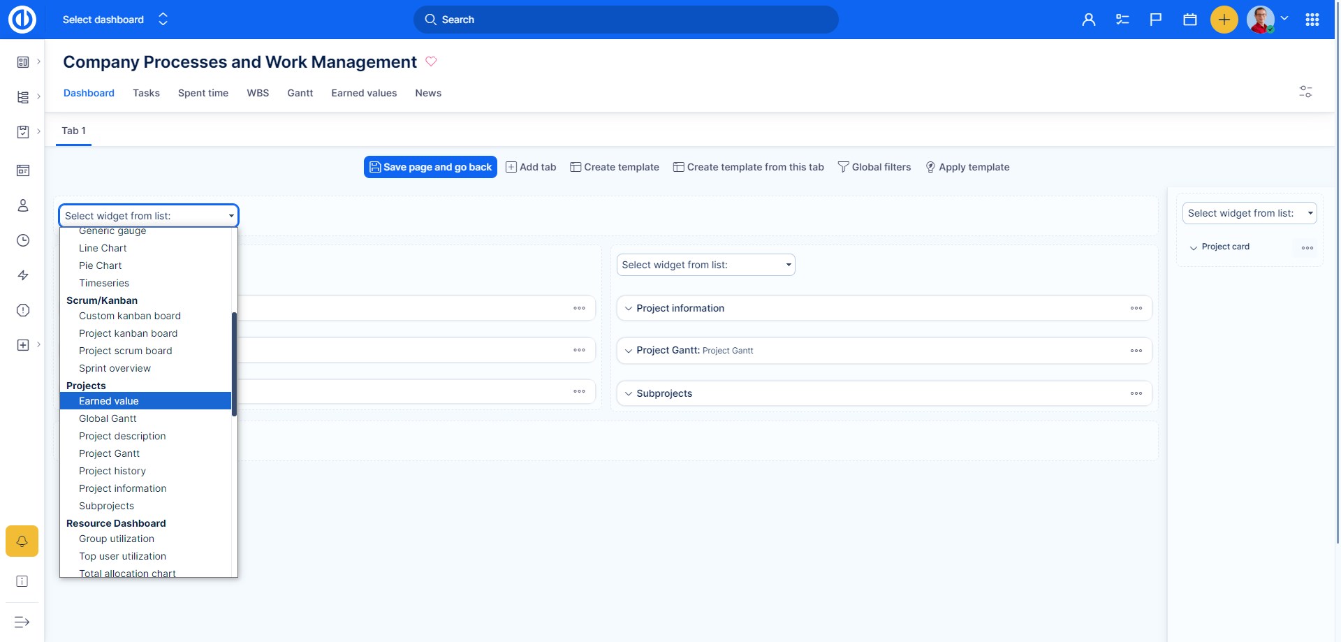 You can simply customize yourDashboard and Project Dashboard by entering the edit mode by clicking on the "Customise this page" button down on the left of the particular page. Here you select widgets to be placed in various sections of the page. To add "Earned Value" widget on a page, just select it from the drop-down list as shown below and save.