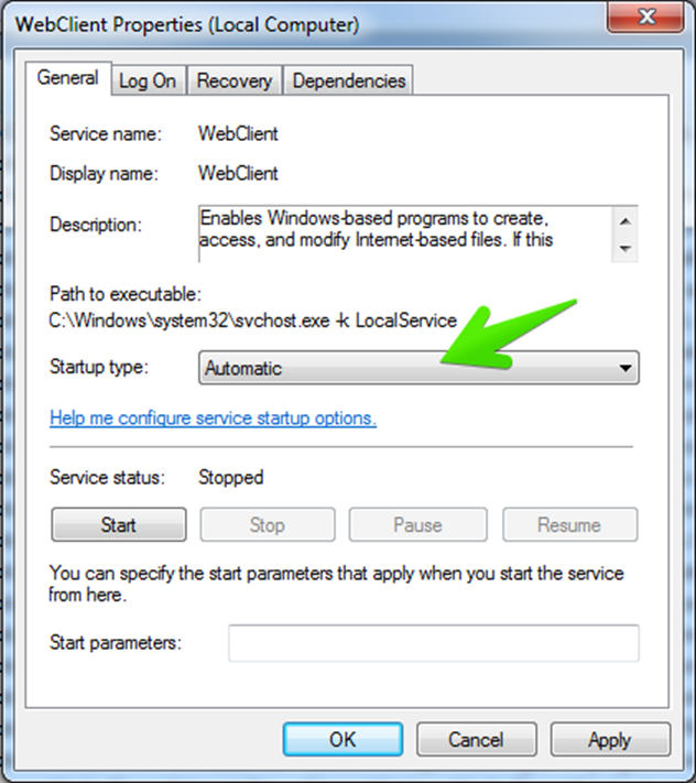 Windows 10, 8.1 and 8 use the WebClient Services to connect to WebDAV Servers, by default the WebClient service is disabled, so we need to enable it, and also change the service to start automatically when Microsoft Windows starts: