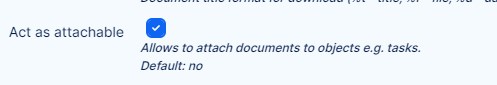 - Act as attachable: [No] - This feature provides the possibility to attach documents to tasks. The new/edit task form contains a Drag&Drop area for uploading documents.