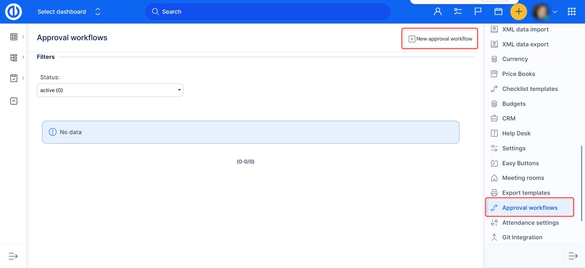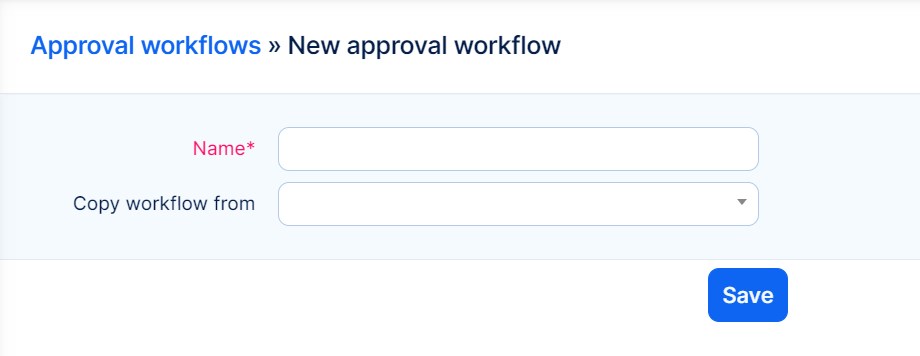 To create a new approval workflow click on the respective button in the top right corner. Then you are expected to enter a name of the new approval wokflow. If you already have created some approval workflows, you can copy one into the new one by selecting it from "Copy workflow from" in the dropdown menu.
