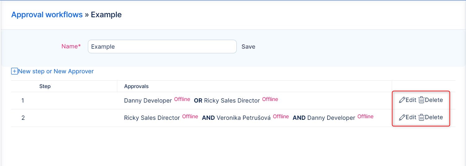 Using the New step button you can choose one or more approvals and by clicking on AND or OR button you will add a new approval step to the end or by choosing an existing step from the list to an existing step.